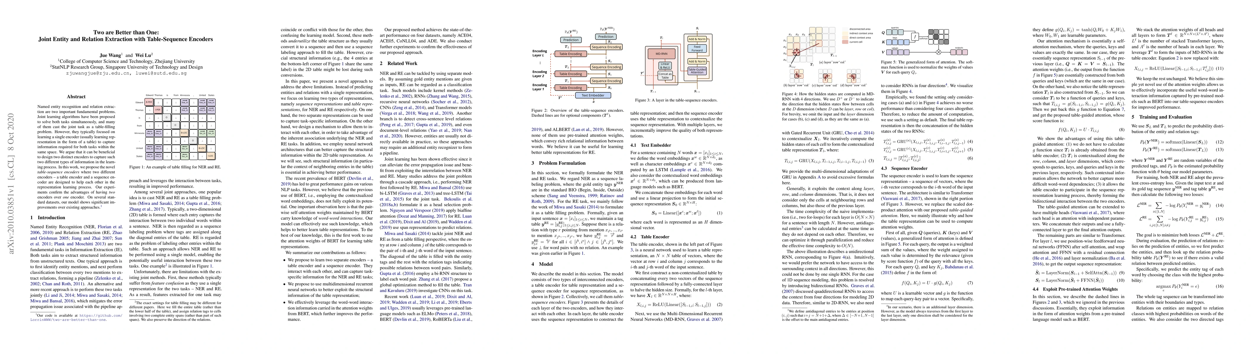 A new approach to joint entity and relation extraction uses two separate encoders to improve performance on named entity recognition and relation extraction tasks.