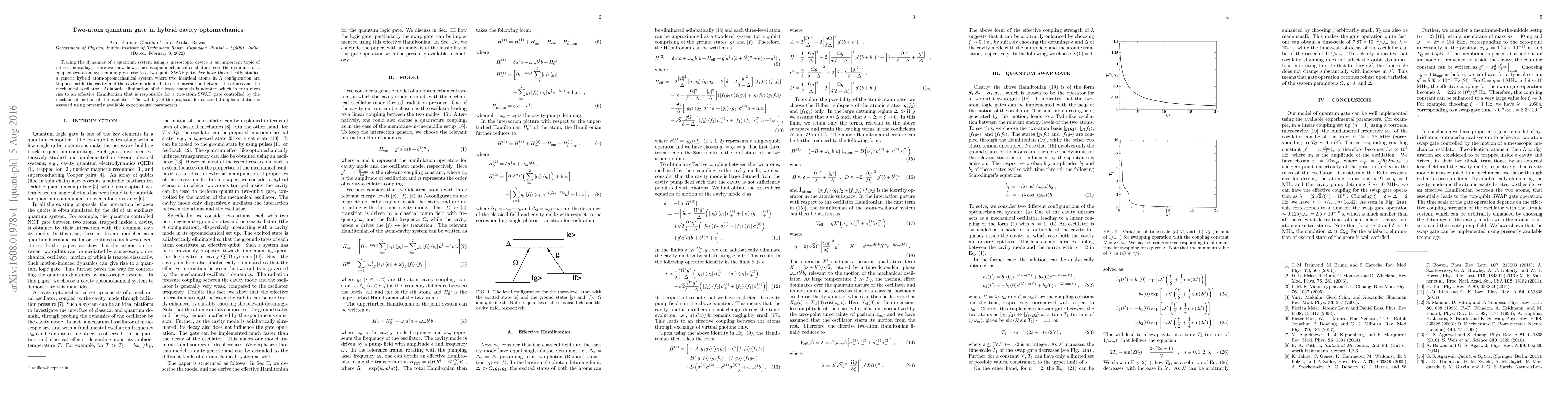 This paper proposes a two-atom quantum gate in a hybrid atom-optomechanical system where a mechanical oscillator mediates the interaction between two atoms, resulting in a SWAP gate. The study employs adiabatic elimination of lossy channels to derive an effective Hamiltonian that governs the gate's dynamics, and assesses its feasibility with current experimental parameters.