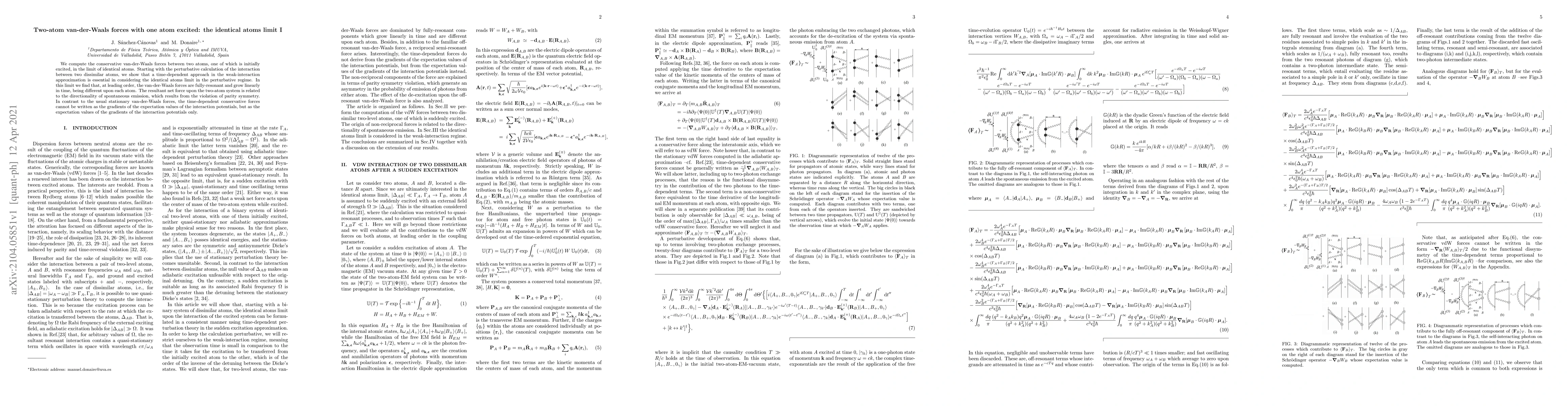 We compute the conservative van-der-Waals forces between two atoms, one of which is initially excited, in the limit of identical atoms. Starting with the perturbative calculation of the interaction between two dissimilar atoms, we show that a time-dependent approach in the weak-interaction approximation is essential in considering the identical atoms limit in the perturbative regime. In this limit we find that, at leading order, the van-der-Waals forces are fully-resonant and grow linearly in time, being different upon each atom. The resultant net force upon the two-atom system is related to the directionality of spontaneous emission, which results from the violation of parity symmetry. In contrast to the usual stationary van-der-Waals forces, the time-dependent conservative forces cannot be written as the gradients of the expectation values of the interaction potentials, but as the expectation values of the gradients of the interaction potentials only.