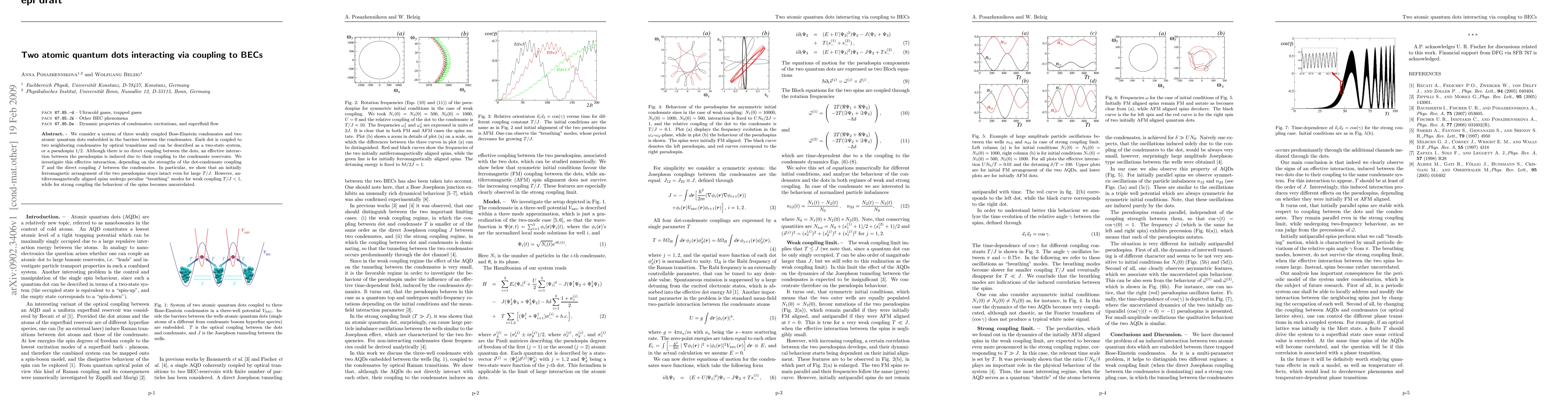 We consider a system of three weakly coupled Bose-Einstein condensates and two atomic quantum dots embedded in the barriers between the condensates. Each dot is coupled to two neighboring condensates by optical transitions and can be described as a two-state system, or a pseudospin 1/2. Although there is no direct coupling between the dots, an effective interaction between the pseudospins is induced due to their coupling to the condensate reservoirs. We investigate this effective interaction, depending on the strengths of the dot-condensate coupling T and the direct coupling J between the condensates. In particular, we show that an initially ferromagnetic arrangement of the two pseudospins stays intact even for large T/J. However, antiferromagnetically aligned spins undergo peculiar "breathing" modes for weak coupling T/J<1, while for strong coupling the behaviour of the spins becomes uncorrelated.