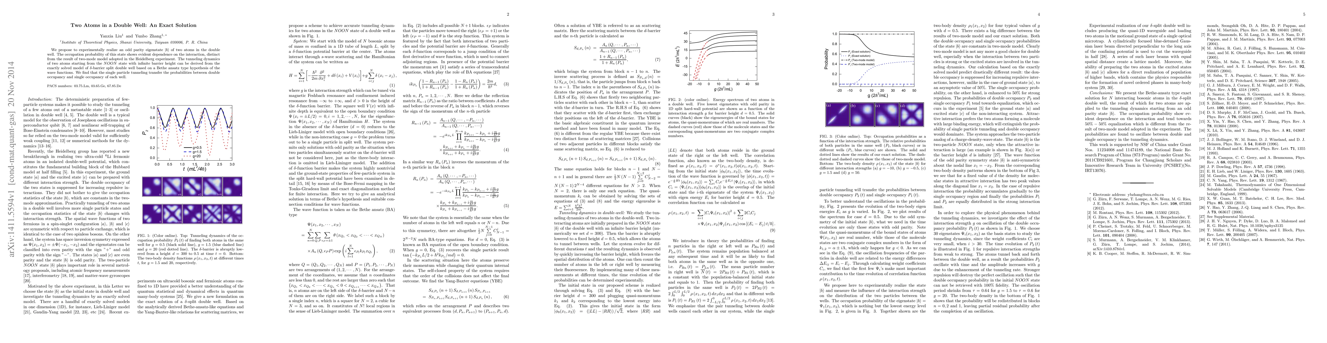 We propose to experimentally realize an odd parity eigenstate $\left\vert b\right\rangle $ of two atoms in the double well. The occupation probability of this state shows evident dependence on the interaction, distinct from the result of two-mode model adopted in the Heidelberg experiment. The tunneling dynamics of two atoms starting from the $NOON$ state with infinite barrier height can be derived from the exactly solved model of $\delta $-barrier split double well based on a Bethe ansatz type hypothesis of the wave functions. We find that the single particle tunneling transfer the probabilities between double occupancy and single occupancy of each well.