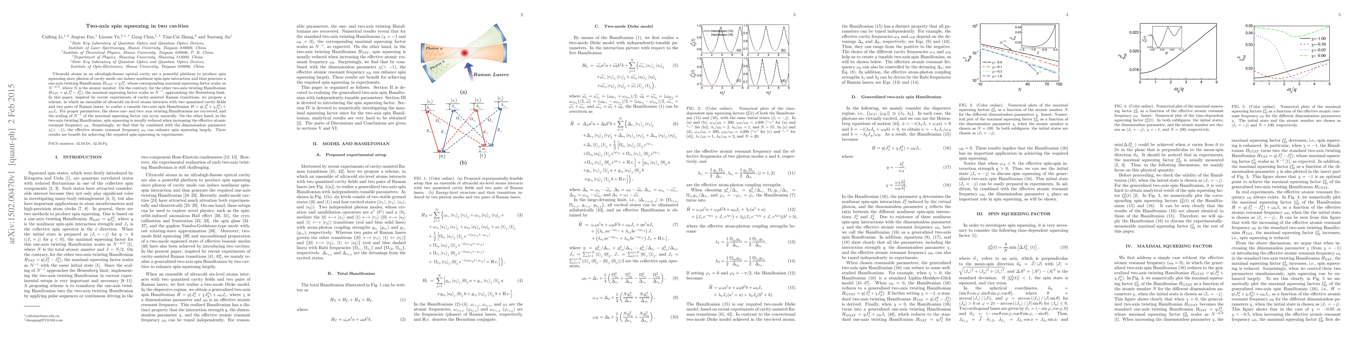This paper proposes a scheme using ultracold six-level atoms interacting with two cavity fields and Raman lasers to achieve tunable two-axis spin squeezing. The scheme can recover both one-axis and two-axis twisting Hamiltonians, with the latter scaling to the Heisenberg limit, and demonstrates an enhancement of spin squeezing despite increased atomic resonant frequency, aiding experimental realization.