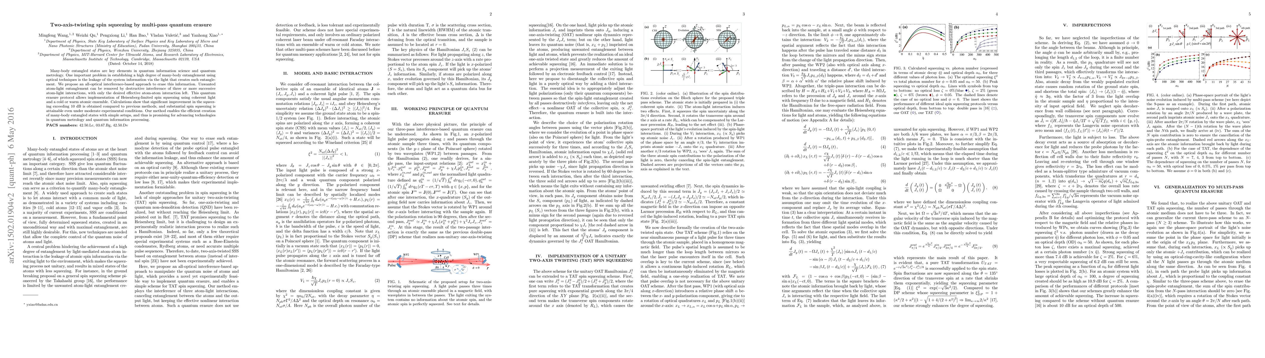 This paper proposes an all-optical interference-based method for achieving two-axis-twisting spin squeezing through multi-pass quantum erasure, enabling the efficient creation of many-body entangled states. The technique significantly improves spin squeezing by over 10 dB compared to previous methods, making it promising for quantum metrology and information processing.