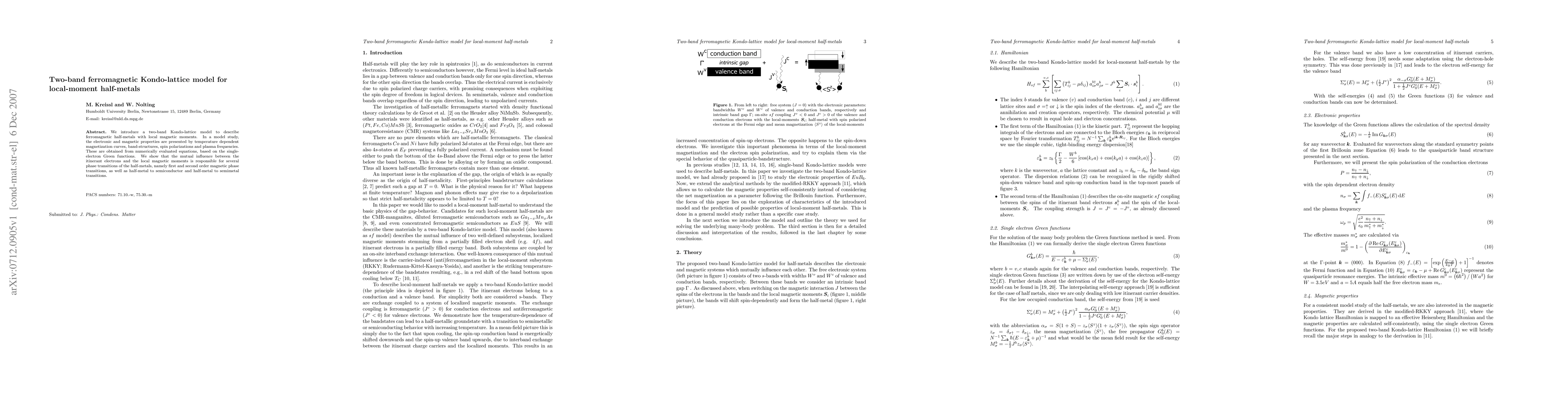This paper presents a two-band Kondo-lattice model for ferromagnetic half-metals with local magnetic moments, revealing electronic and magnetic properties through temperature-dependent magnetization, band structures, and spin polarizations. The study identifies phase transitions driven by the interaction between itinerant electrons and local moments.