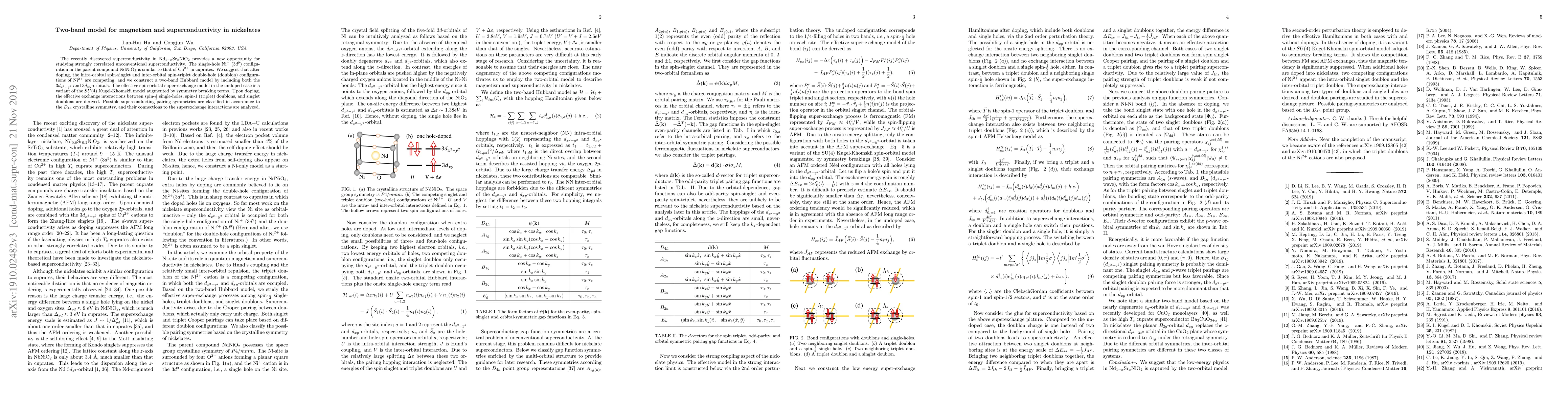 Researchers propose a two-band model to explain magnetism and superconductivity in nickelates, suggesting competing spin-singlet and spin-triplet configurations that lead to unique pairing symmetries.