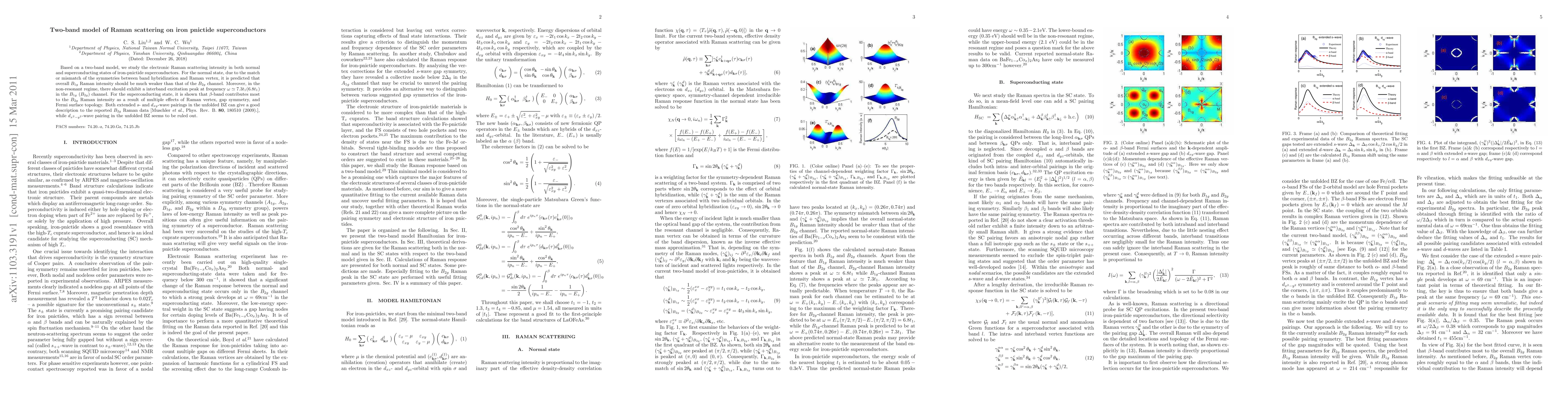 Based on a two-band model, we study the electronic Raman scattering intensity in both normal and superconducting states of iron-pnictide superconductors. For the normal state, due to the match or mismatch of the symmetries between band hybridization and Raman vertex, it is predicted that overall $B_{1g}$ Raman intensity should be much weaker than that of the $B_{2g}$ channel. Moreover, in the non-resonant regime, there should exhibit a interband excitation peak at frequency $\omega\simeq 7.3 t_1 (6.8t_1)$ in the $B_{1g}$ ($B_{2g}$) channel. For the superconducting state, it is shown that $\beta$-band contributes most to the $B_{2g}$ Raman intensity as a result of multiple effects of Raman vertex, gap symmetry, and Fermi surface topology. Both extended $s$- and $d_{xy}$-wave pairings in the unfolded BZ can give a good description to the reported $B_{2g}$ Raman data [Muschler {\em et al.}, Phys. Rev. B. {\bf 80}, 180510 (2009).], while $d_{x^2-y^2}$-wave pairing in the unfolded BZ seems to be ruled out.
