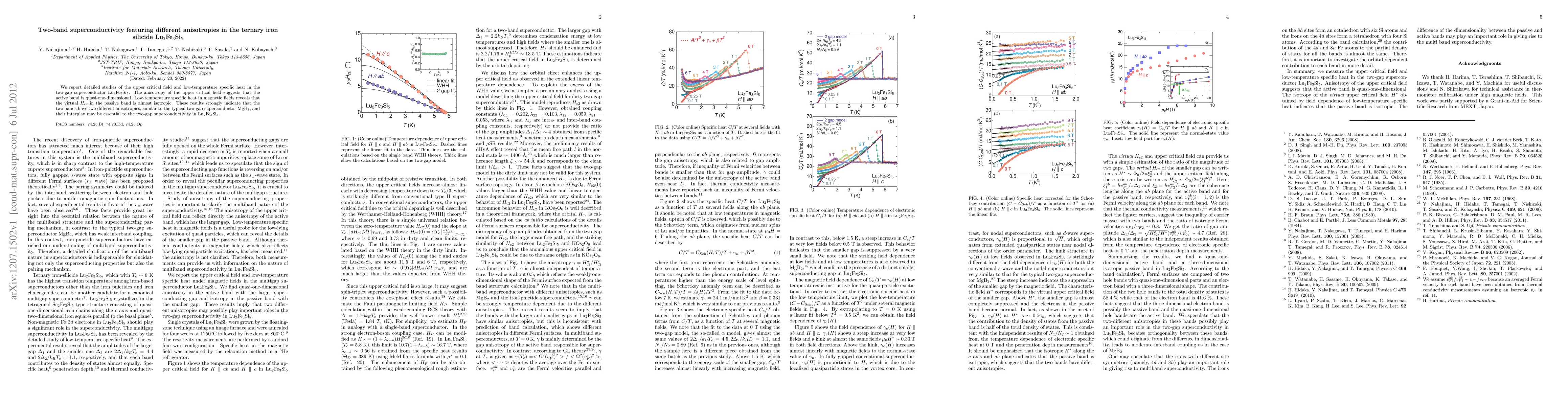 We report detailed studies of the upper critical field and low-temperature specific heat in the two-gap superconductor Lu$_{2}$Fe$_{3}$Si$_{5}$. The anisotropy of the upper critical field suggests that the active band is quasi-one-dimensional. Low-temperature specific heat in magnetic fields reveals that the virtual $H_{c2}$ in the passive band is almost isotropic. These results strongly indicate that the two bands have two different anisotropies, similar to the typical two-gap superconductor MgB$_{2}$, and their interplay may be essential to the two-gap superconductivity in Lu$_{2}$Fe$_{3}$Si$_{5}$.