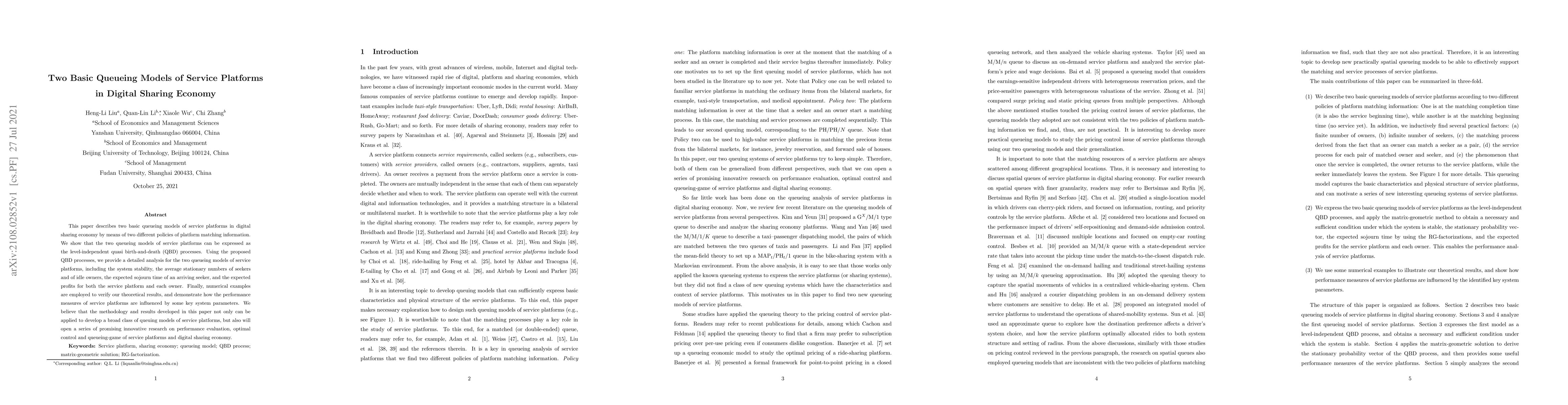 This paper presents two queueing models for service platforms in the digital sharing economy, expressed as level-independent quasi birth-and-death processes, and analyzes system stability, average numbers, sojourn times, and profits. Numerical examples validate the theoretical results and highlight the impact of key parameters on performance.