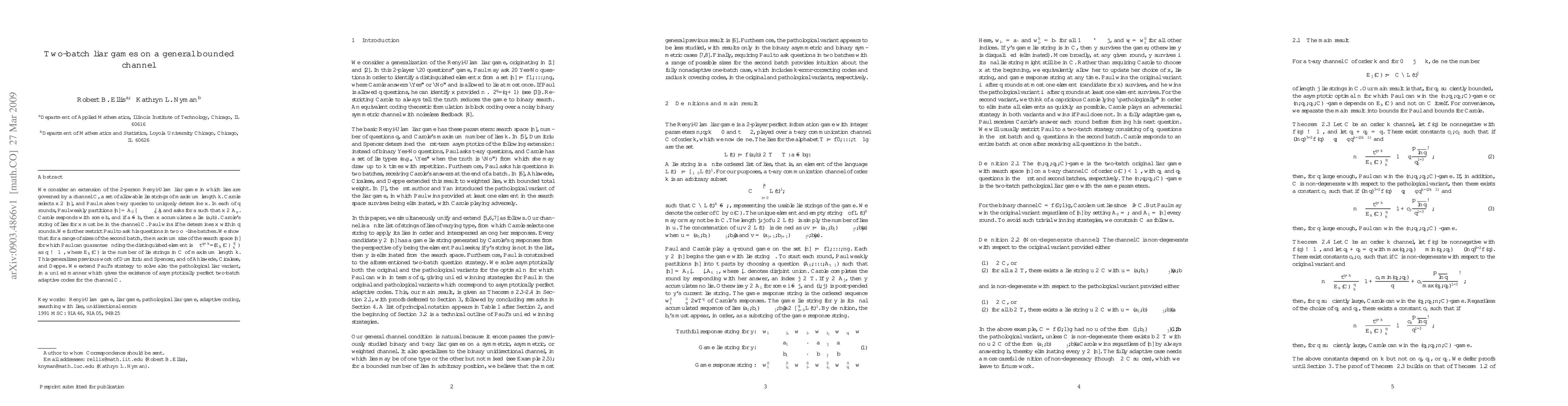 We consider an extension of the 2-person R\'enyi-Ulam liar game in which lies are governed by a channel $C$, a set of allowable lie strings of maximum length $k$. Carole selects $x\in[n]$, and Paul makes $t$-ary queries to uniquely determine $x$. In each of $q$ rounds, Paul weakly partitions $[n]=A_0\cup >... \cup A_{t-1}$ and asks for $a$ such that $x\in A_a$. Carole responds with some $b$, and if $a\neq b$, then $x$ accumulates a lie $(a,b)$. Carole's string of lies for $x$ must be in the channel $C$. Paul wins if he determines $x$ within $q$ rounds. We further restrict Paul to ask his questions in two off-line batches. We show that for a range of sizes of the second batch, the maximum size of the search space $[n]$ for which Paul can guarantee finding the distinguished element is $\sim t^{q+k}/(E_k(C)\binom{q}{k})$ as $q\to\infty$, where $E_k(C)$ is the number of lie strings in $C$ of maximum length $k$. This generalizes previous work of Dumitriu and Spencer, and of Ahlswede, Cicalese, and Deppe. We extend Paul's strategy to solve also the pathological liar variant, in a unified manner which gives the existence of asymptotically perfect two-batch adaptive codes for the channel $C$.