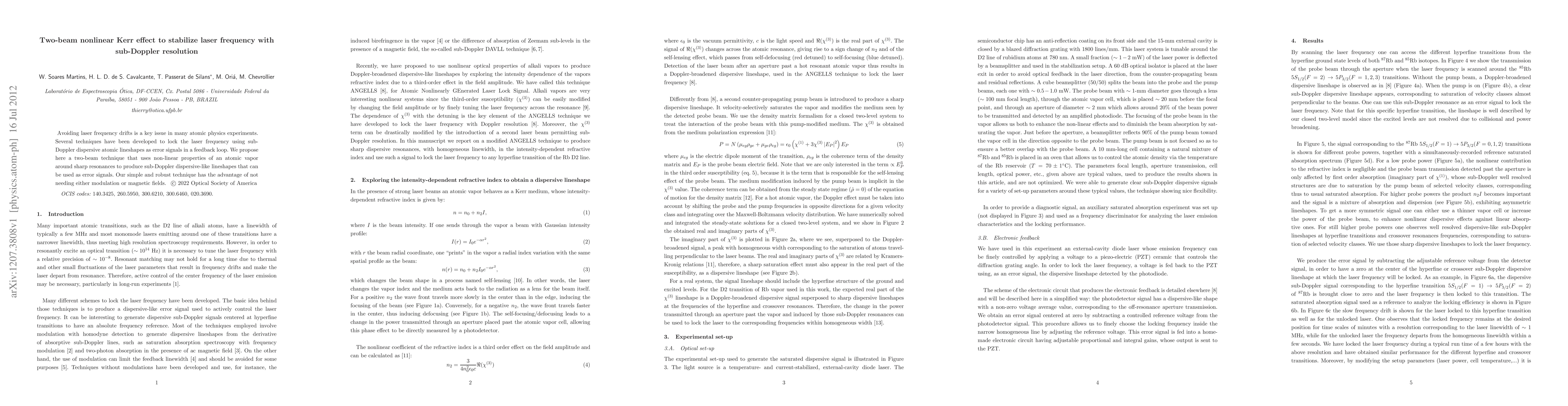 This research proposes a two-beam nonlinear Kerr effect technique to stabilize laser frequency using sub-Doppler dispersive-like lineshapes from atomic vapors without requiring modulation or magnetic fields. The method aims to address laser frequency drifts crucial in atomic physics experiments.