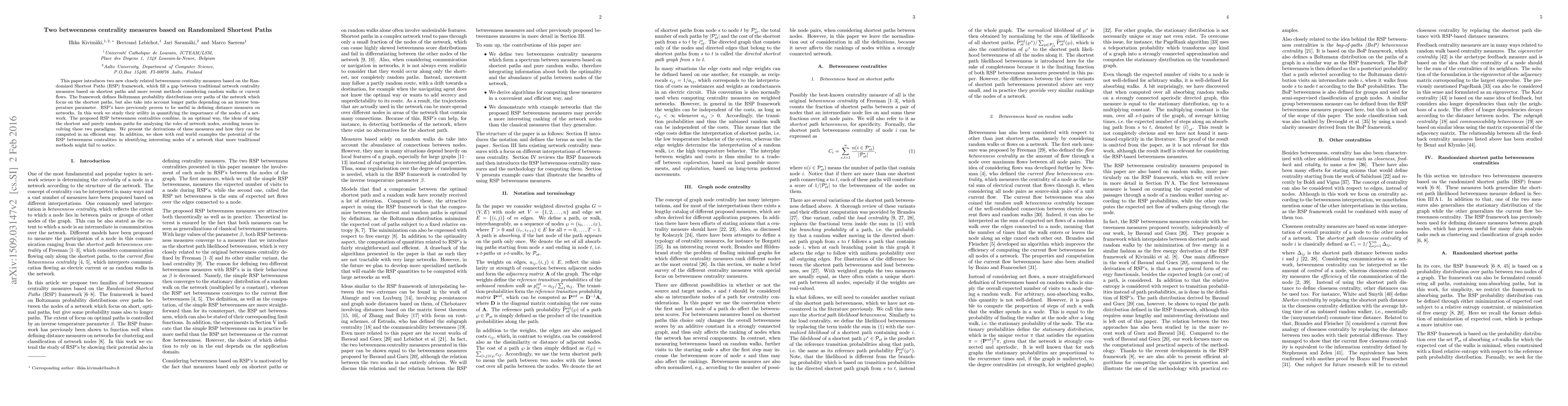 This paper introduces two new betweenness centrality measures based on Randomized Shortest Paths (RSP) framework, combining shortest and random paths for network node analysis, avoiding issues of traditional shortest path and random walk methods.