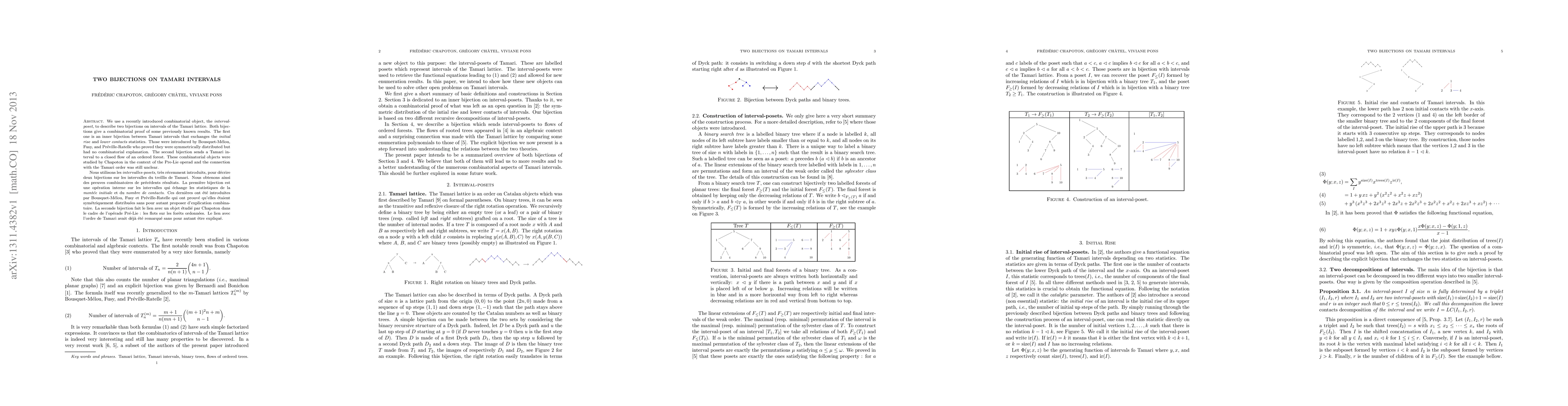 This paper introduces two bijections on intervals of the Tamari lattice using interval-posets, providing combinatorial proofs for previously known results. The first bijection swaps initial rise and lower contact statistics, while the second maps Tamari intervals to closed flows of ordered forests, clarifying their connection to the Pre-Lie operad.