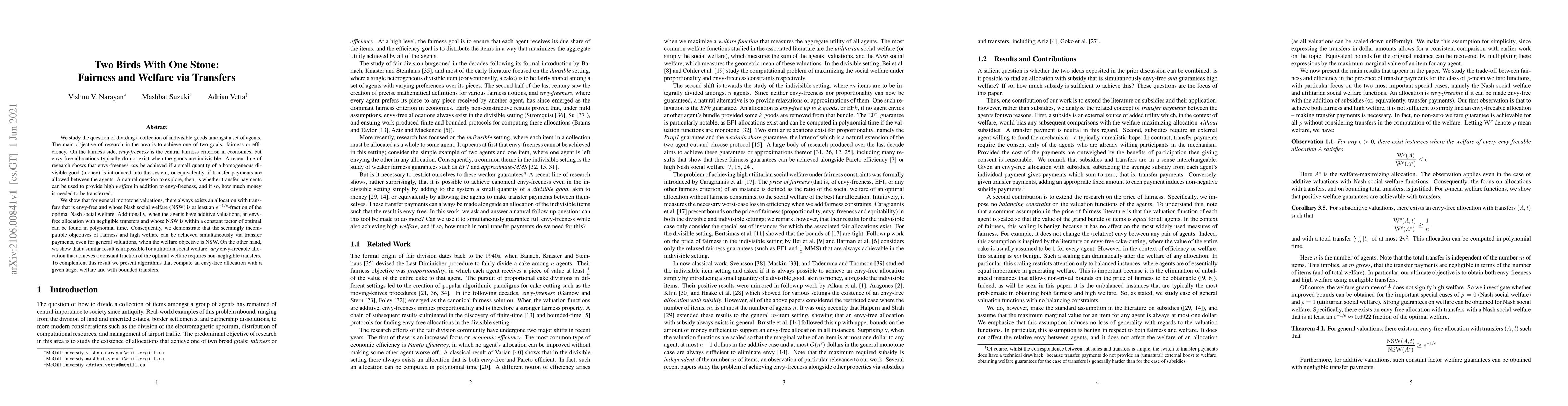 Researchers found that transfers can achieve both fairness and high welfare in allocation of indivisible goods among agents, with a specific minimum amount of transfer required for envy-freeness and Nash social welfare.