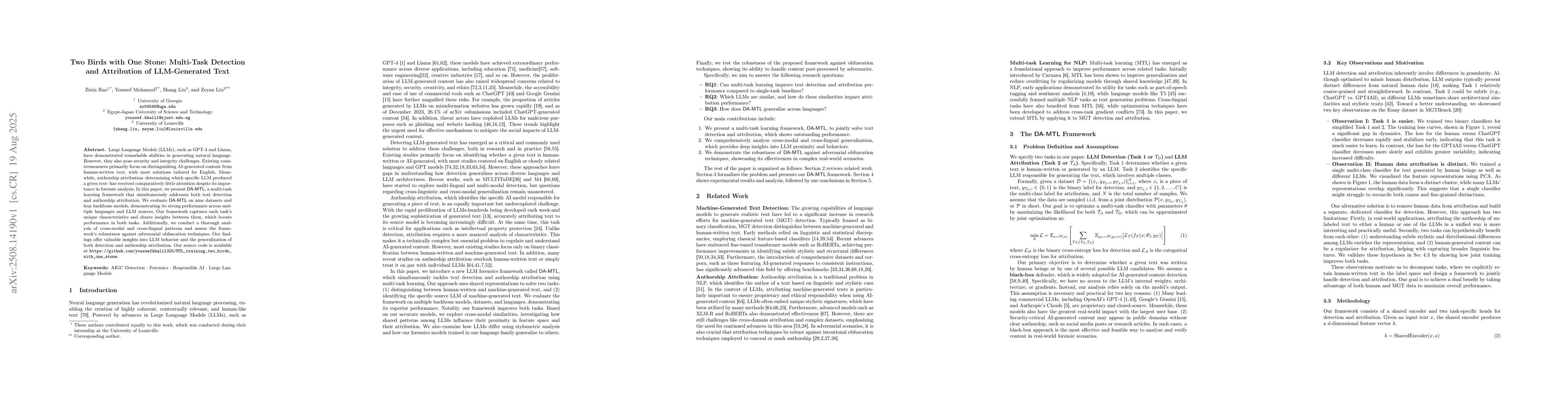 Large Language Models (LLMs), such as GPT-4 and Llama, have demonstrated remarkable abilities in generating natural language. However, they also pose security and integrity challenges. Existing countermeasures primarily focus on distinguishing AI-generated content from human-written text, with most solutions tailored for English. Meanwhile, authorship attribution--determining which specific LLM produced a given text--has received comparatively little attention despite its importance in forensic analysis. In this paper, we present DA-MTL, a multi-task learning framework that simultaneously addresses both text detection and authorship attribution. We evaluate DA-MTL on nine datasets and four backbone models, demonstrating its strong performance across multiple languages and LLM sources. Our framework captures each task's unique characteristics and shares insights between them, which boosts performance in both tasks. Additionally, we conduct a thorough analysis of cross-modal and cross-lingual patterns and assess the framework's robustness against adversarial obfuscation techniques. Our findings offer valuable insights into LLM behavior and the generalization of both detection and authorship attribution.