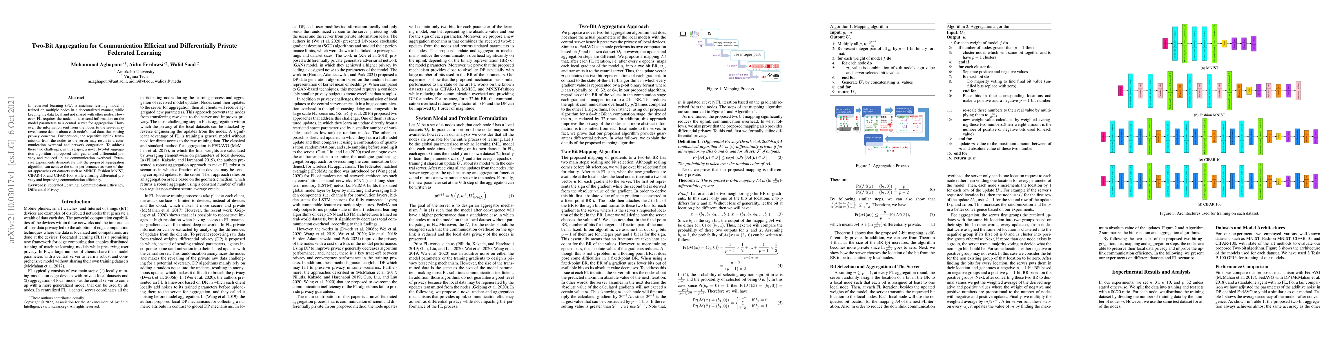 In federated learning (FL), a machine learning model is trained on multiple nodes in a decentralized manner, while keeping the data local and not shared with other nodes. However, FL requires the nodes to also send information on the model parameters to a central server for aggregation. However, the information sent from the nodes to the server may reveal some details about each node's local data, thus raising privacy concerns. Furthermore, the repetitive uplink transmission from the nodes to the server may result in a communication overhead and network congestion. To address these two challenges, in this paper, a novel two-bit aggregation algorithm is proposed with guaranteed differential privacy and reduced uplink communication overhead. Extensive experiments demonstrate that the proposed aggregation algorithm can achieve the same performance as state-of-the-art approaches on datasets such as MNIST, Fashion MNIST, CIFAR-10, and CIFAR-100, while ensuring differential privacy and improving communication efficiency.
