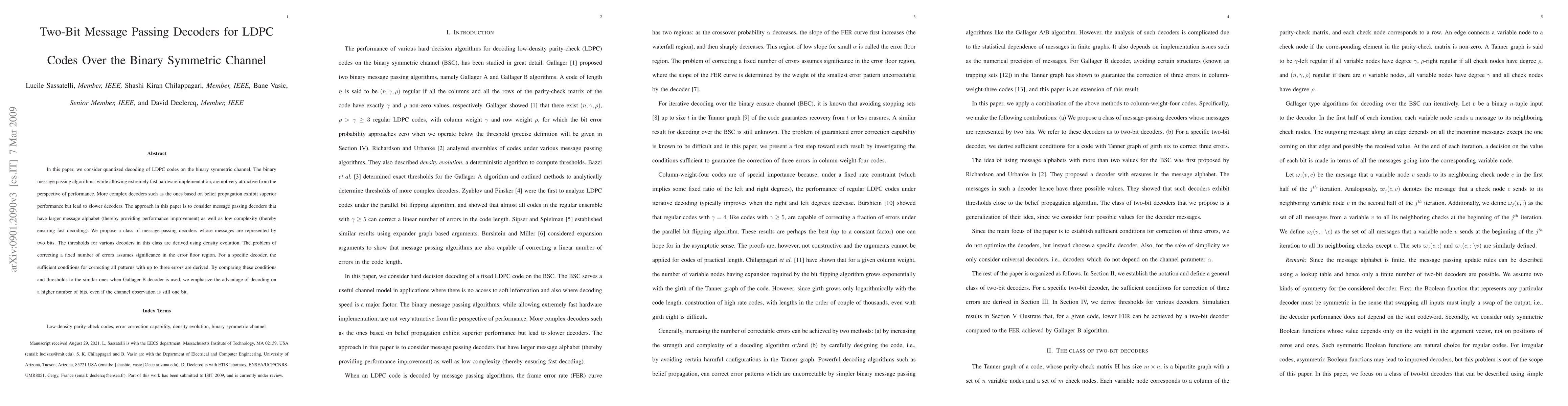 In this paper, we consider quantized decoding of LDPC codes on the binary symmetric channel. The binary message passing algorithms, while allowing extremely fast hardware implementation, are not very attractive from the perspective of performance. More complex decoders such as the ones based on belief propagation exhibit superior performance but lead to slower decoders. The approach in this paper is to consider message passing decoders that have larger message alphabet (thereby providing performance improvement) as well as low complexity (thereby ensuring fast decoding). We propose a class of message-passing decoders whose messages are represented by two bits. The thresholds for various decoders in this class are derived using density evolution. The problem of correcting a fixed number of errors assumes significance in the error floor region. For a specific decoder, the sufficient conditions for correcting all patterns with up to three errors are derived. By comparing these conditions and thresholds to the similar ones when Gallager B decoder is used, we emphasize the advantage of decoding on a higher number of bits, even if the channel observation is still one bit.