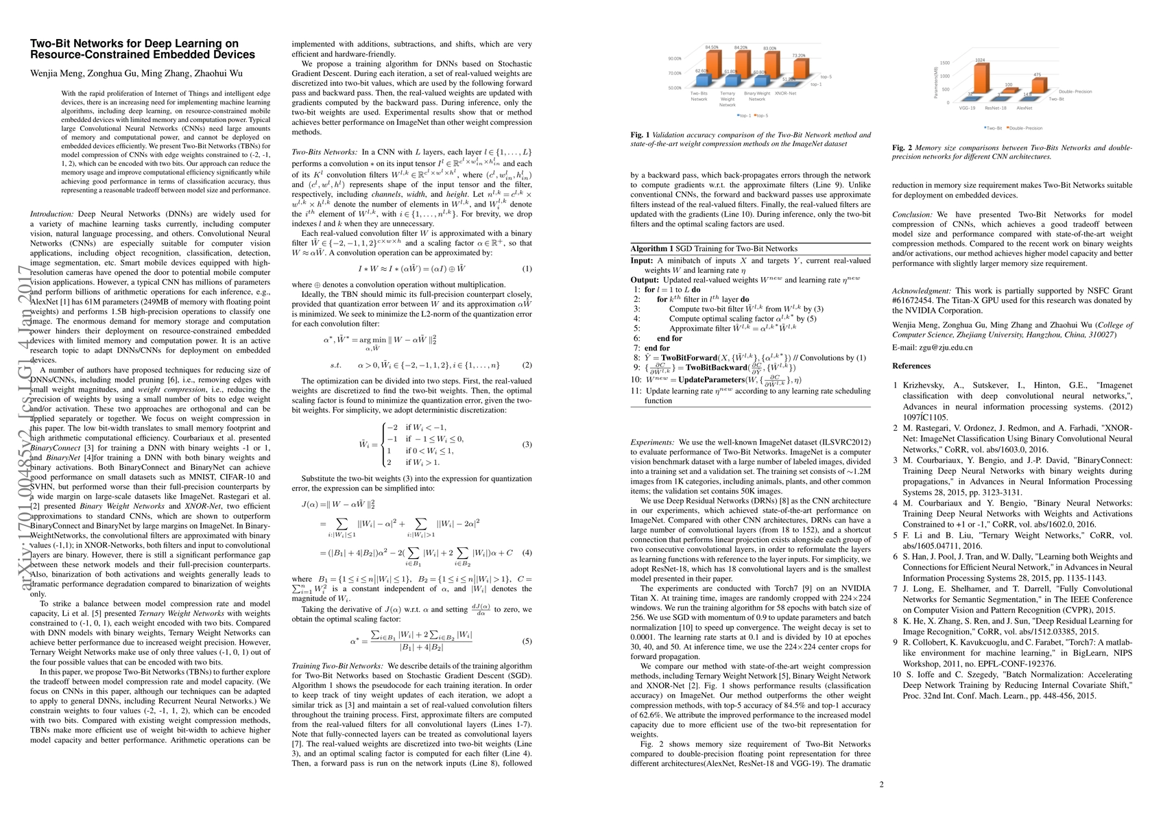 This paper proposes Two-Bit Networks (TBNs) to efficiently deploy deep learning on resource-constrained embedded devices by compressing Convolutional Neural Networks (CNNs) with edge weights limited to four values, enabling two-bit encoding. This method significantly reduces memory usage and computational demands while maintaining acceptable classification accuracy.