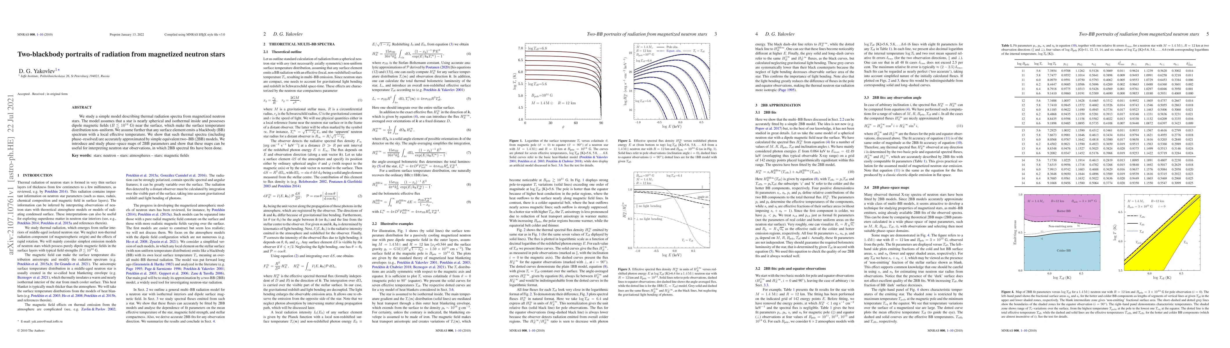 We study a simple model describing thermal radiation spectra from magnetized neutron stars. The model assumes that a star is nearly spherical and isothermal inside and possesses dipole magnetic fields ($B \lesssim 10^{14}$ G) near the surface, which make the surface temperature distribution non--uniform. We assume further that any surface element emits a blackbody (BB) spectrum with a local effective temperature. We show that such thermal spectra (including phase--resolved) are accurately approximated by simple equivalent two--BB (2BB) models. We introduce and study phase--space maps of 2BB parameters and show that these maps can be useful for interpreting neutron star observations, in which 2BB spectral fits have been done.