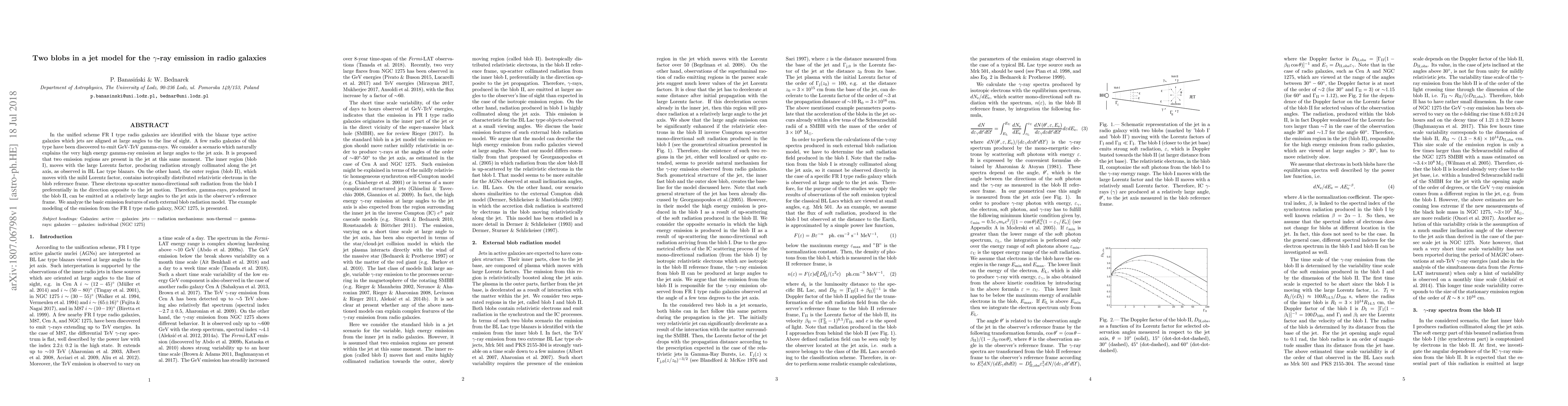 In the unified scheme FR I type radio galaxies are identified with the blazar type active galaxies which jets are aligned at large angles to the line of sight. A few radio galaxies of this type have been discovered to emit GeV-TeV gamma-rays. We consider a scenario which naturally explains the very high energy gamma-ray emission at large angles to the jet axis. It is proposed that two emission regions are present in the jet at this same moment. The inner region (blob I), moves with the large Lorentz factor, producing radiation strongly collimated along the jet axis, as observed in BL Lac type blazars. On the other hand, the outer region (blob II), which moves with the mild Lorentz factor, contains isotropically distributed relativistic electrons in the blob reference frame. These electrons up-scatter mono-directional soft radiation from the blob I preferentially in the direction opposite to the jet motion. Therefore, gamma-rays, produced in the blob II, can be emitted at a relatively large angles to the jet axis in the observer's reference frame. We analyze the basic emission features of such external blob radiation model. The example modeling of the emission from the FR I type radio galaxy, NGC 1275, is presented.