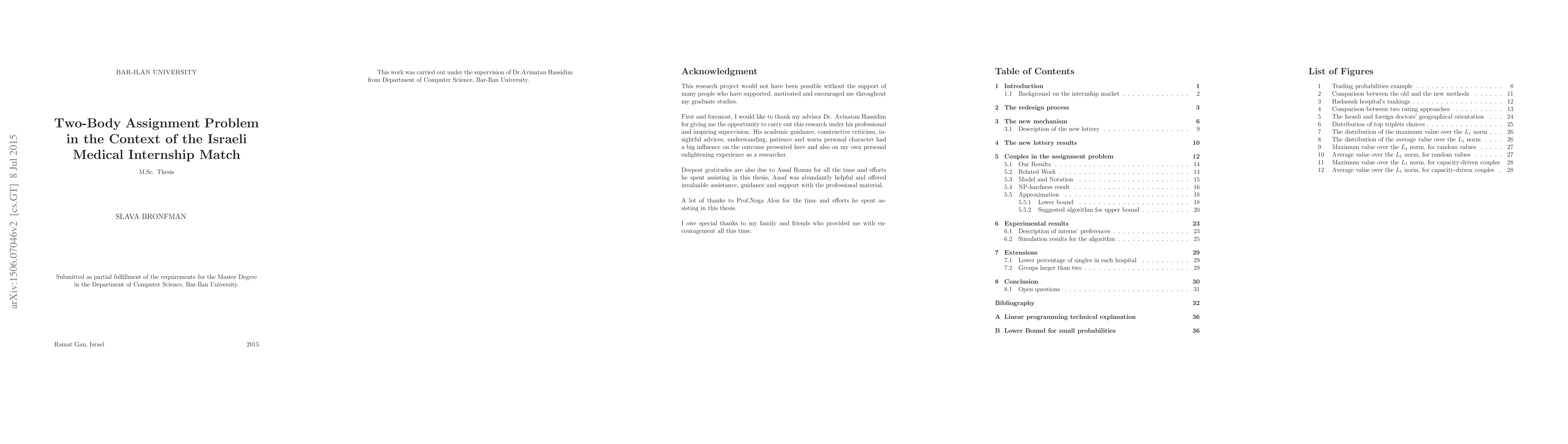 This thesis was submitted as partial fulfillment of the requirements for the Masters Degree in the Department of Computer Science, Bar-Ilan University. The final step in getting an Israeli M.D. is performing a year-long internship in one of the hospitals in Israel. Internships are decided upon by a lottery, which is known as "The Internship Lottery". In 2014 we redesigned the lottery, replacing it with a more efficient one. The new method is based on calculating a tentative lottery, in which each student has some probability of getting to each hospital. Then a computer program "trades" between the students, where trade is performed only if it is beneficial to both sides. This trade creates surplus, which translates to more students getting one of their top choices. The average student improved his place by $0.91$ seats. The new method can improve the welfare of medical graduates, by giving them more probability to get to one of their top choices. It can be applied in internship markets in other countries as well. This thesis presents the market, the redesign process and the new mechanism which is now in use. There are two main lessons that we have learned from this market. The first is the "Do No Harm" principle, which states that (almost) all participants should prefer the new mechanism to the old one. The second is that new approaches need to be used when dealing with two-body problems in object assignment. We focus on the second lesson, and study two-body problems in the context of the assignment problem. We show that decomposing stochastic assignment matrices to deterministic allocations is NP-hard in the presence of couples, and present a polynomial time algorithm with the optimal worst case guarantee. We also study the performance of our algorithm on real-world and on simulated data.