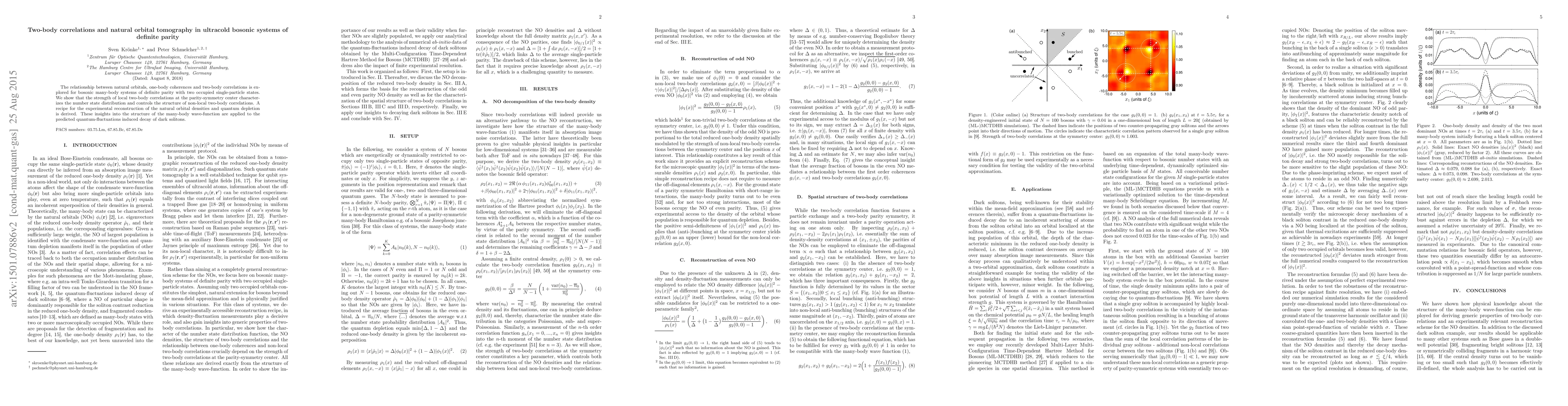 The relationship between natural orbitals, one-body coherences and two-body correlations is explored for bosonic many-body systems of definite parity with two occupied single-particle states. We show that the strength of local two-body correlations at the parity-symmetry center characterizes the number state distribution and controls the structure of non-local two-body correlations. A recipe for the experimental reconstruction of the natural orbital densities and quantum depletion is derived. These insights into the structure of the many-body wave-function are applied to the predicted quantum-fluctuations induced decay of dark solitons.