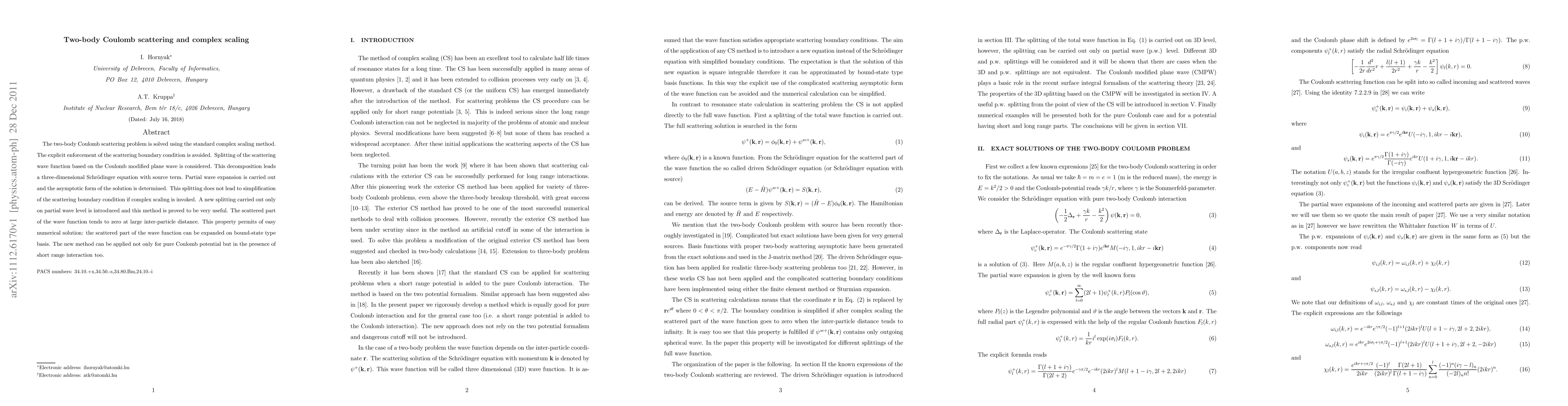 This paper solves the two-body Coulomb scattering problem using complex scaling, introducing a new partial wave level splitting method that simplifies numerical solutions. The new method ensures the scattered wave function vanishes at large distances, facilitating easy numerical expansion on a bound-state basis, applicable to both pure Coulomb and short-range interactions.