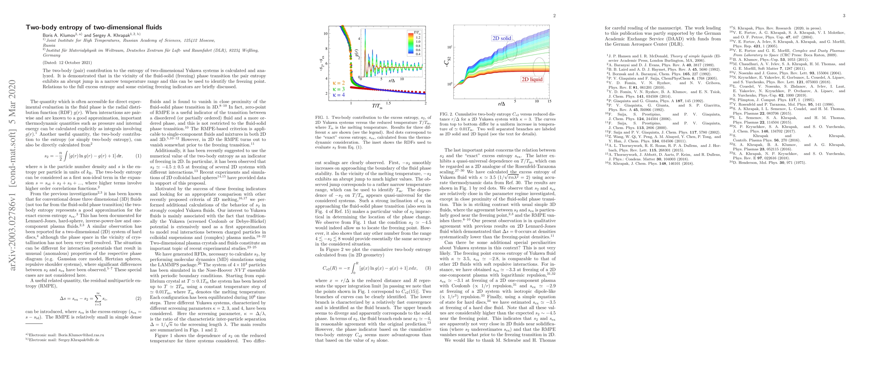 The two-body (pair) contribution to the entropy of two-dimensional Yukawa systems is calculated and analyzed. It is demonstrated that in the vicinity of the fluid-solid (freezing) phase transition the pair entropy exhibits an abrupt jump in a narrow temperature range and this can be used to identify the freezing point. Relations to the full excess entropy and some existing freezing indicators are briefly discussed.
