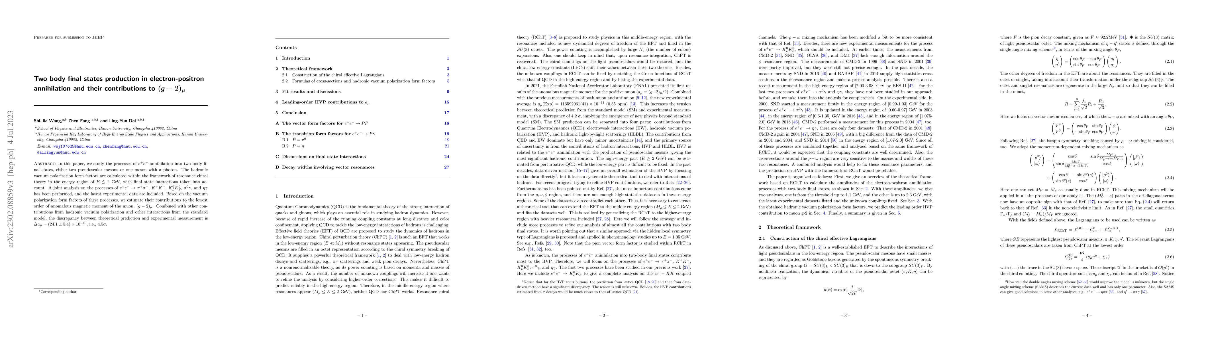 This paper investigates $e^{+}e^{-}$ annihilation into two-body final states, calculating hadronic vacuum polarization form factors and estimating contributions to the muon's anomalous magnetic moment $(g-2)_\mu$. The analysis reveals a discrepancy of $\Delta a_{\mu}=(24.1\pm5.4)\times 10^{-10}$, corresponding to a 4.5$\sigma$ deviation from experimental measurements.