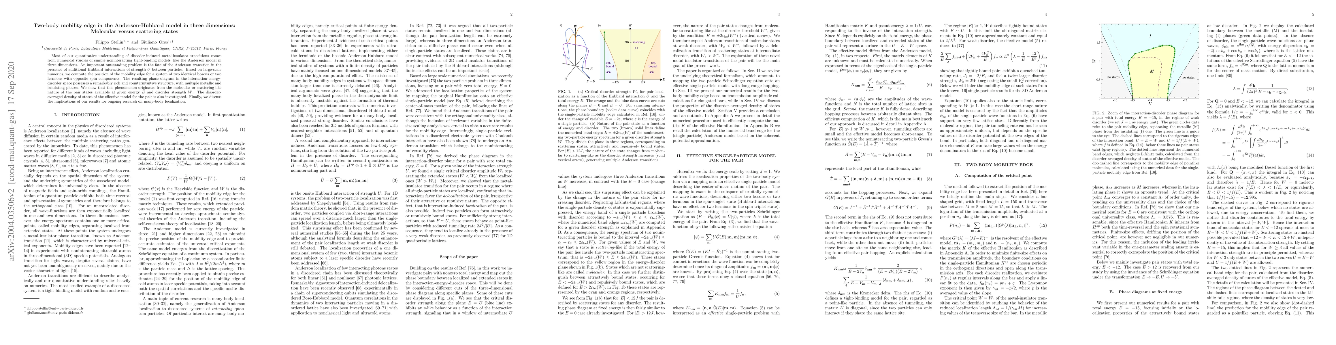 Most of our quantitative understanding of disorder-induced metal-insulator transitions comes from numerical studies of simple noninteracting tight-binding models, like the Anderson model in three dimensions. An important outstanding problem is the fate of the Anderson transition in the presence of additional Hubbard interactions of strength $U$ between particles. Based on large-scale numerics, we compute the position of the mobility edge for a system of two identical bosons or two fermions with opposite spin components. The resulting phase diagram in the interaction-energy-disorder space possesses a remarkably rich and counterintuitive structure, with multiple metallic and insulating phases. We show that this phenomenon originates from the molecular or scattering-like nature of the pair states available at given energy $E$ and disorder strength $W$. The disorder-averaged density of states of the effective model for the pair is also investigated. Finally, we discuss the implications of our results for ongoing research on many-body localization.