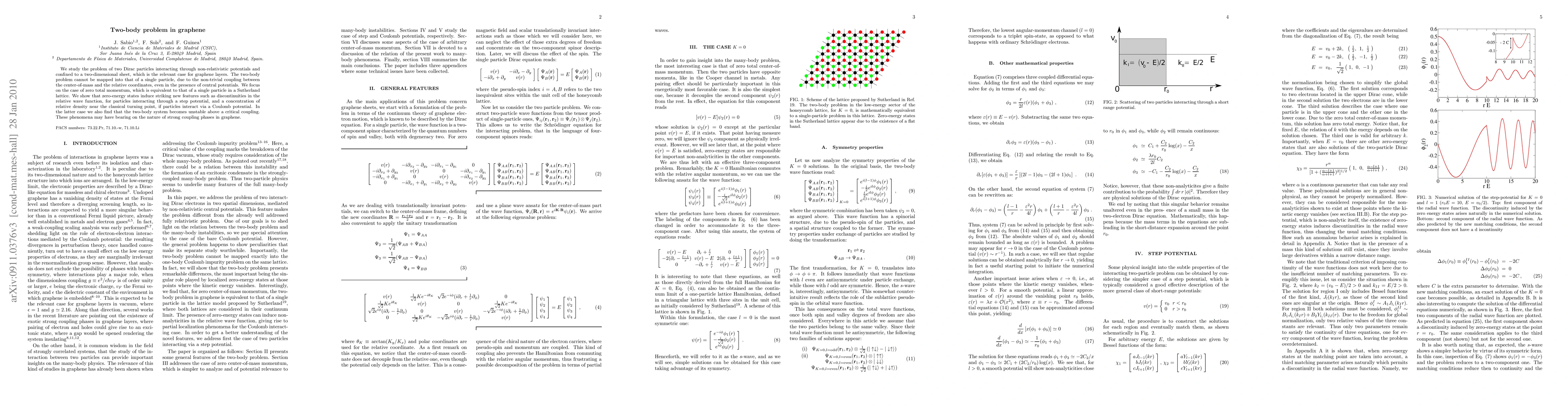 This paper investigates the two-body problem for Dirac particles in graphene, revealing unique interactions due to non-trivial coupling between center-of-mass and relative coordinates. It highlights phenomena such as discontinuities in the relative wave function and density concentration, especially for step and Coulomb potentials, and notes the instability of the system at high coupling.