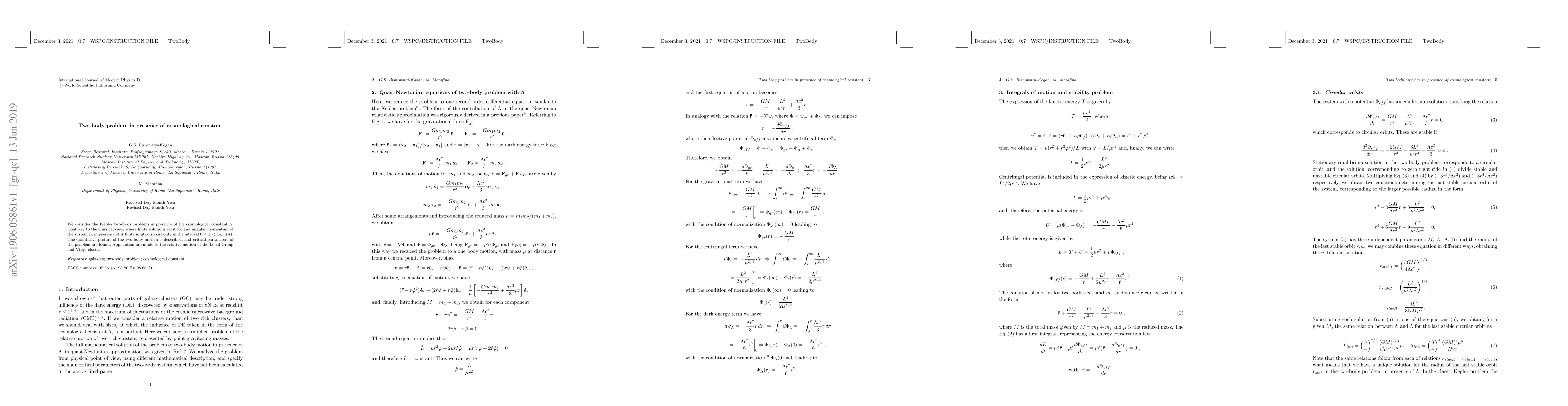 The two-body problem with a cosmological constant has finite solutions only for specific angular momentum ranges, differing from classical mechanics. This limits the motion of celestial bodies like the Local Group and Virgo cluster.