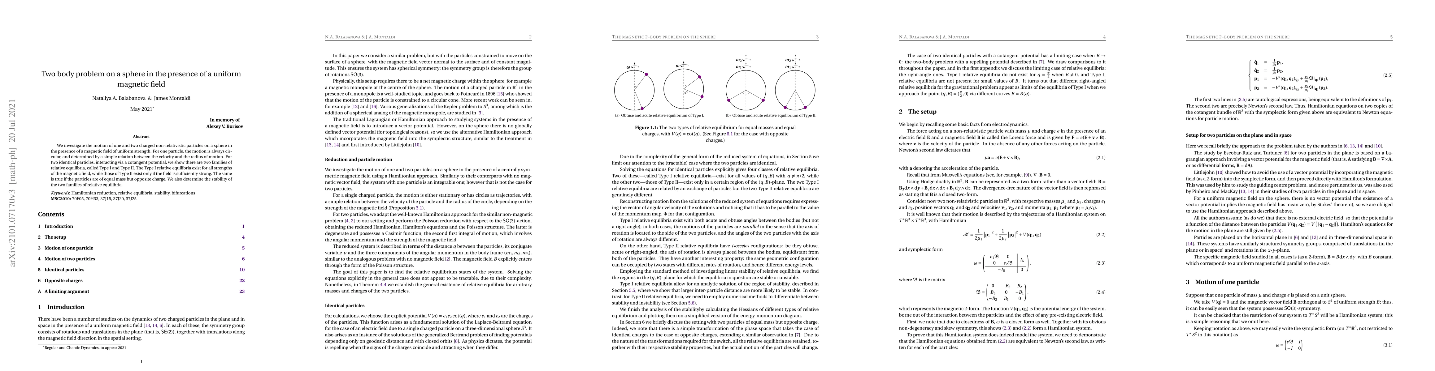 The motion of charged particles on a sphere in a uniform magnetic field is analyzed, revealing two families of relative equilibria for two identical particles interacting via a cotangent potential, stable under certain conditions.