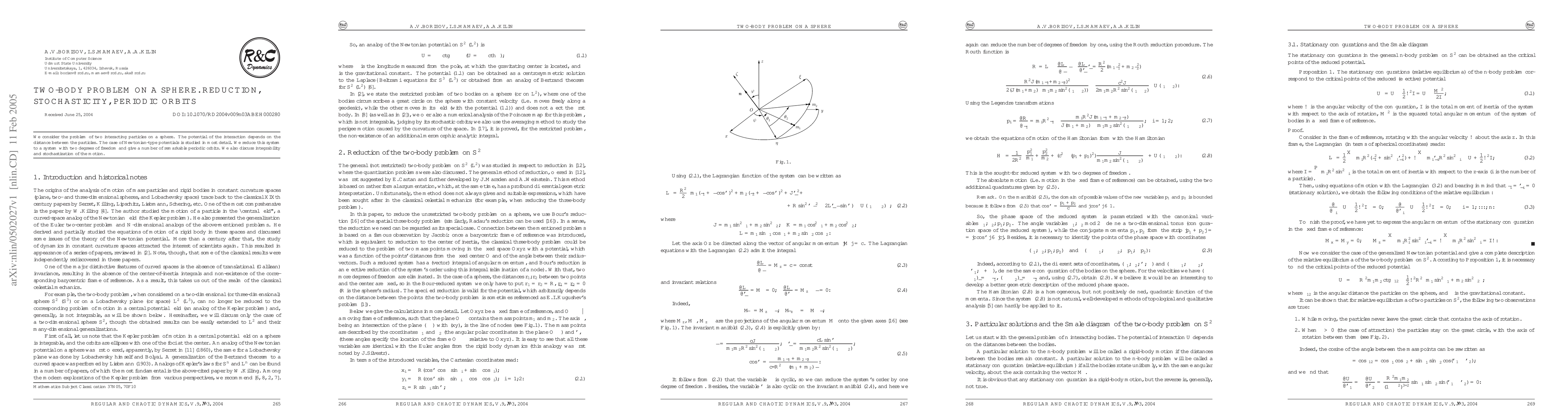 Researchers studied two interacting particles on a sphere, reducing it to a system with two degrees of freedom and discovering periodic orbits. They also explored integrability and stochastization of the motion in this Newtonian-type potential system.