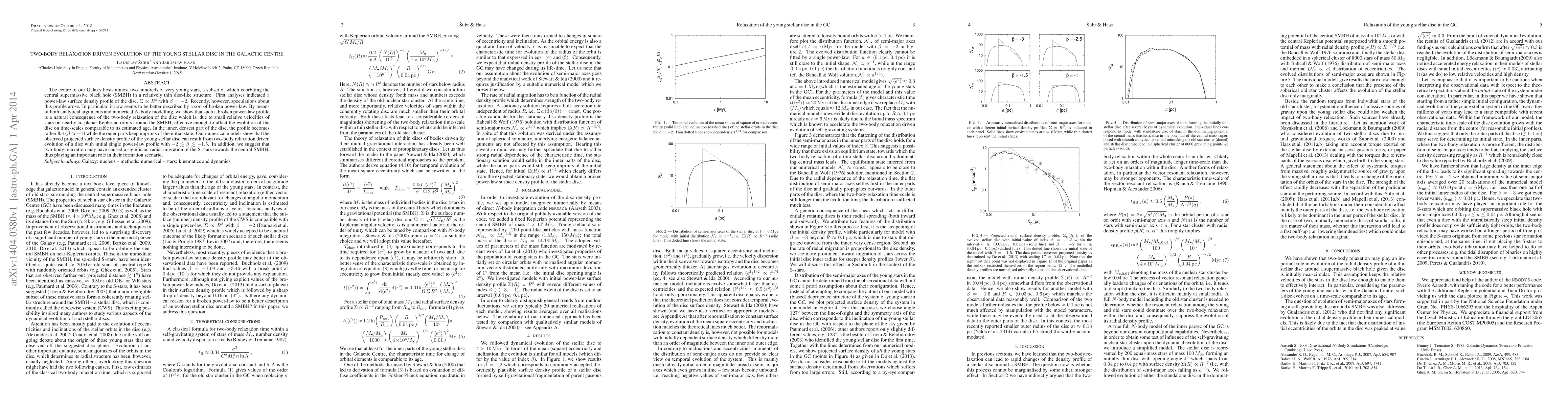 This paper investigates the evolution of the young stellar disc in the Galactic Centre, demonstrating that two-body relaxation processes lead to a broken power-law surface density profile. The inner part of the disc exhibits a flatter profile due to relaxation, while the outer part retains initial characteristics, suggesting a significant radial migration of stars towards the central supermassive black hole.