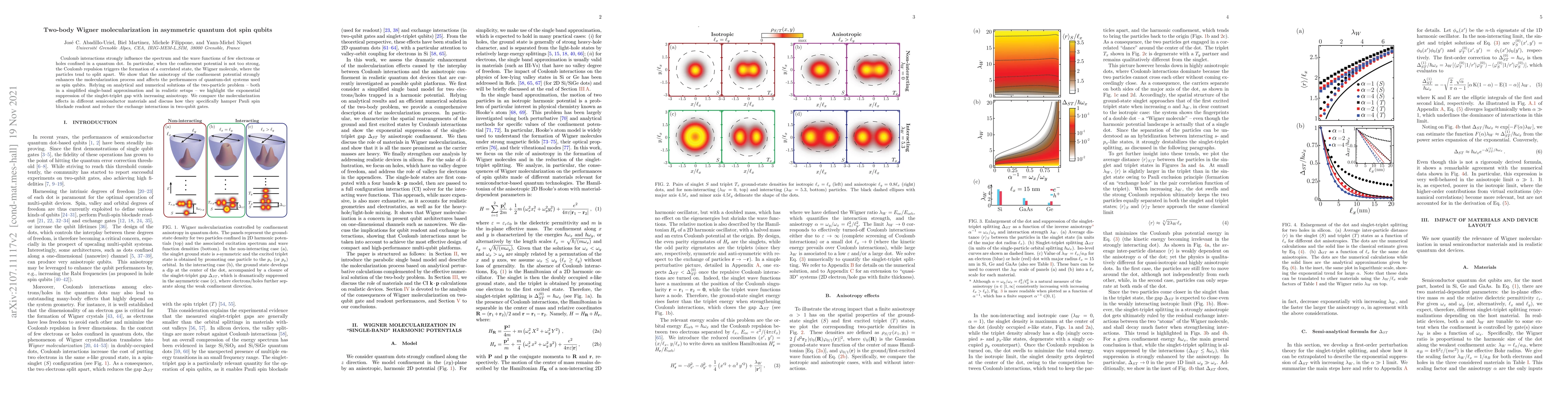 Coulomb interactions strongly influence the spectrum and the wave functions of few electrons or holes confined in a quantum dot. In particular, when the confinement potential is not too strong, the Coulomb repulsion triggers the formation of a correlated state, the Wigner molecule, where the particles tend to split apart. We show that the anisotropy of the confinement potential strongly enhances the molecularization process and affects the performances of quantum-dot systems used as spin qubits. Relying on analytical and numerical solutions of the two-particle problem -- both in a simplified single-band approximation and in realistic setups -- we highlight the exponential suppression of the singlet-triplet gap with increasing anisotropy. We compare the molecularization effects in different semiconductor materials and discuss how they specifically hamper Pauli spin blockade readout and reduce the exchange interactions in two-qubit gates.
