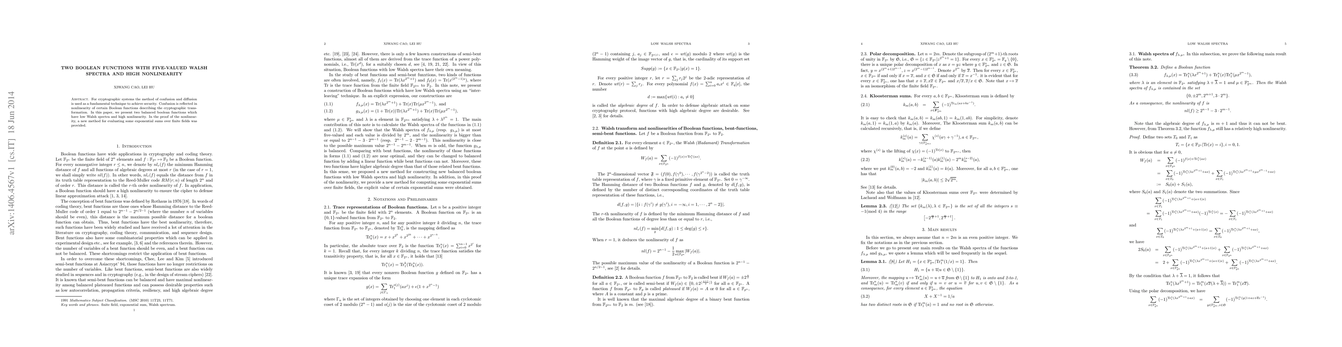 For cryptographic systems the method of confusion and diffusion is used as a fundamental technique to achieve security. Confusion is reflected in nonlinearity of certain Boolean functions describing the cryptographic transformation. In this paper, we present two balanced boolean functions which have low Walsh spectra and high nonlinearity. In the proof of the nonlinearity, a new method for evaluating some exponential sums over finite fields was provided.