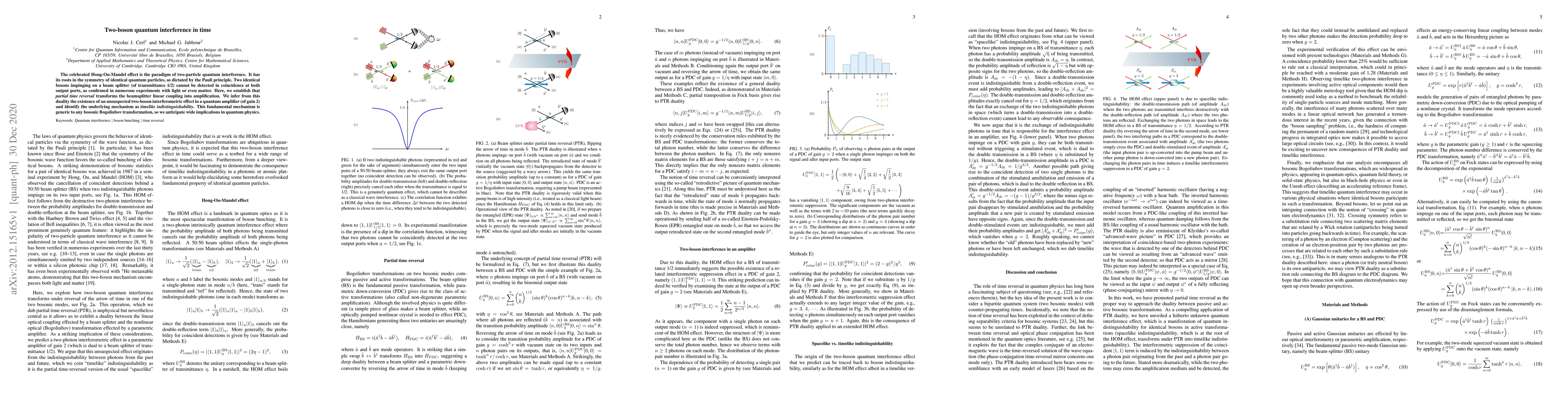 The celebrated Hong-Ou-Mandel effect is the paradigm of two-particle quantum interference. It has its roots in the symmetry of identical quantum particles, as dictated by the Pauli principle. Two identical bosons impinging on a beam splitter (of transmittance 1/2) cannot be detected in coincidence at both output ports, as confirmed in numerous experiments with light or even matter. Here, we establish that partial time reversal transforms the beamsplitter linear coupling into amplification. We infer from this duality the existence of an unsuspected two-boson interferometric effect in a quantum amplifier (of gain 2) and identify the underlying mechanism as timelike indistinguishability. This fundamental mechanism is generic to any bosonic Bogoliubov transformation, so we anticipate wide implications in quantum physics.