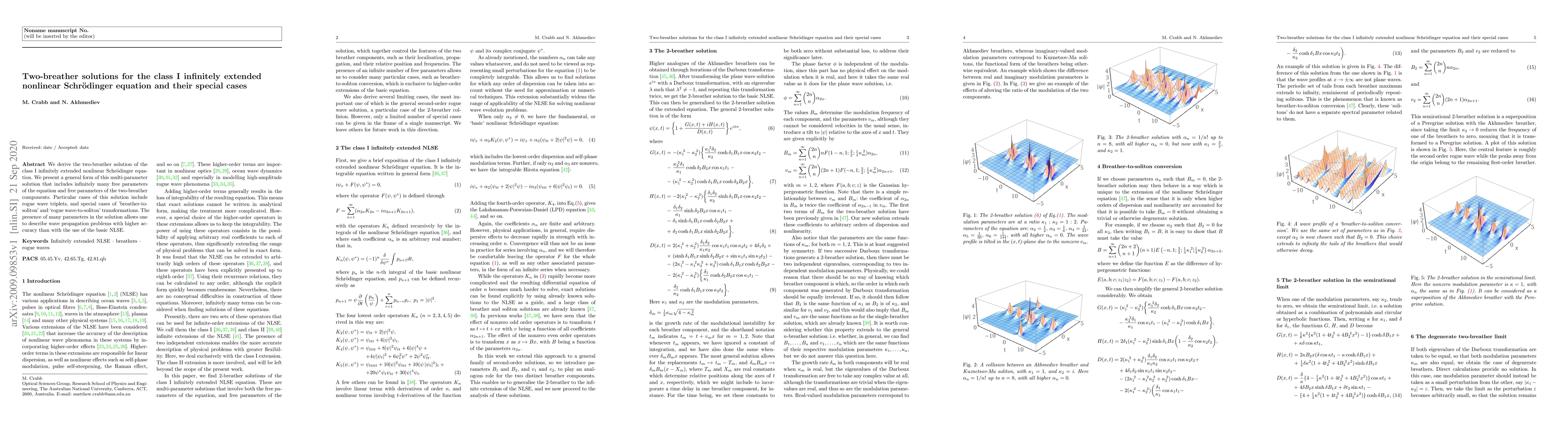 This paper derives a two-breather solution for the class I infinitely extended nonlinear Schrödinger equation, presenting a multi-parameter form that includes numerous free parameters. Special cases include rogue wave triplets and transformations between breathers and solitons, enhancing the accuracy of wave propagation descriptions.