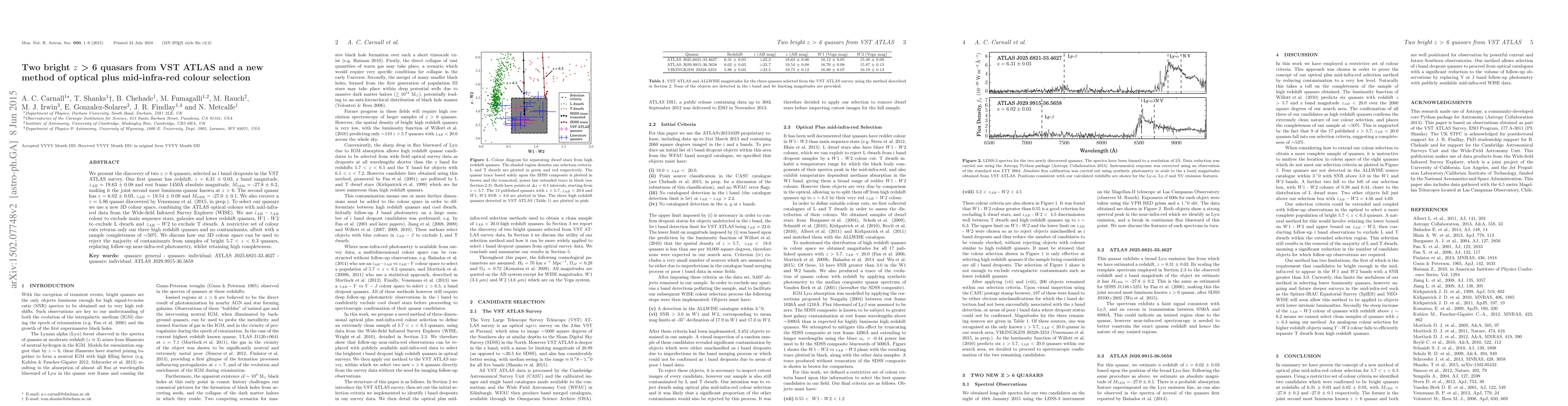 The paper reports the discovery of two z > 6 quasars using a new method combining optical and mid-infrared colour selection from the VST ATLAS and WISE surveys. The method successfully identifies high-redshift quasars while minimizing contaminants.