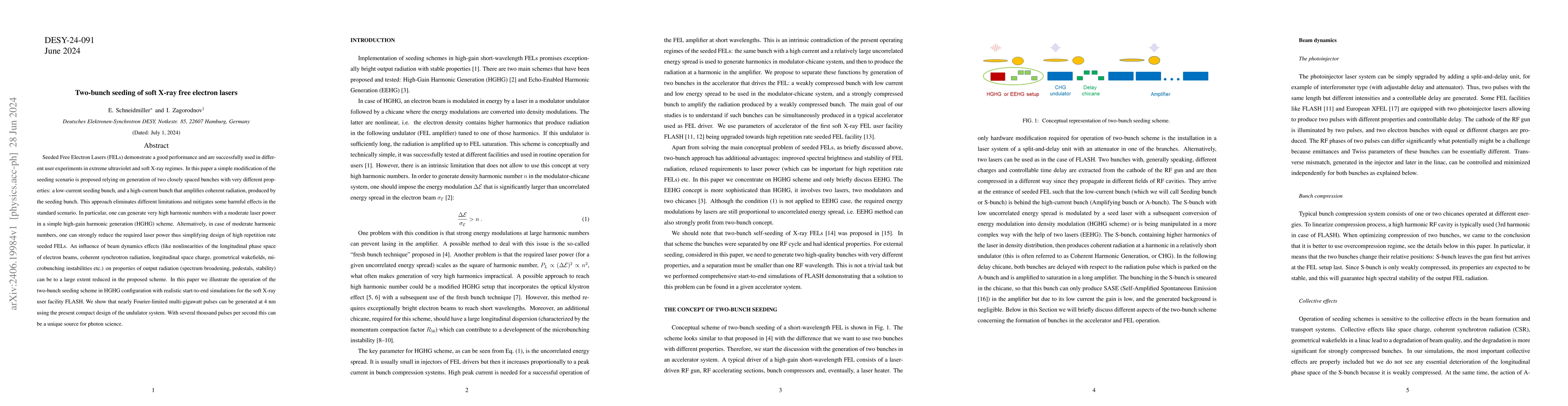 This paper proposes a two-bunch seeding method for soft X-ray free electron lasers, featuring a low-current seeding bunch and a high-current amplification bunch, to generate high harmonic numbers or reduce laser power requirements. Simulations demonstrate its effectiveness in generating nearly Fourier-limited multi-gigawatt pulses at 4 nm for a FLASH facility, offering a unique source for photon science.