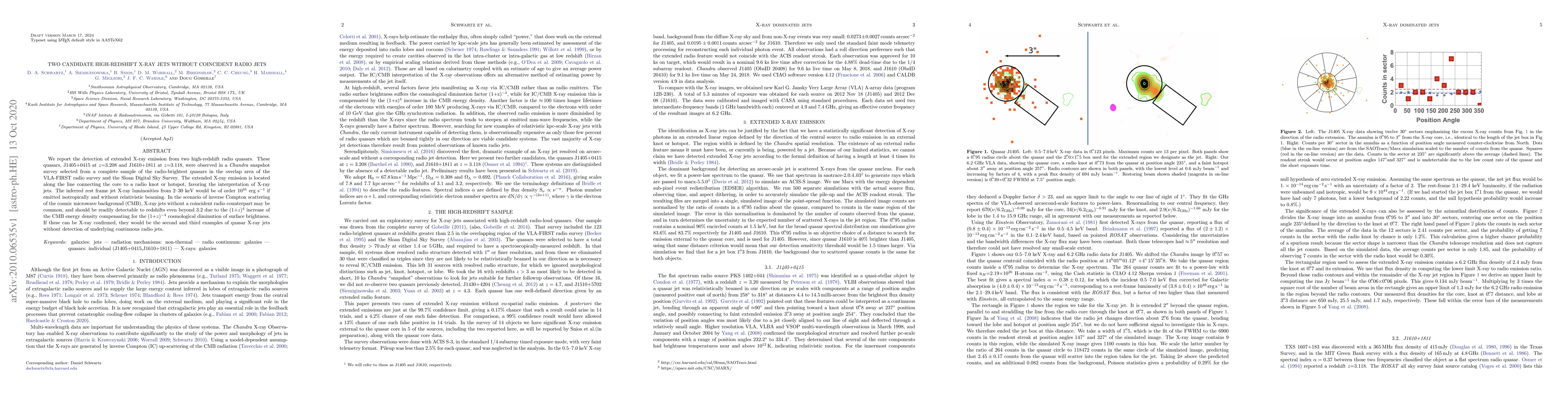 This paper reports the detection of extended X-ray jets in two high-redshift quasars, J1405+0415 and J1610+1811, which lack coincident radio jets. The findings suggest that X-ray jets without radio counterparts may be common due to inverse Compton scattering of the cosmic microwave background.