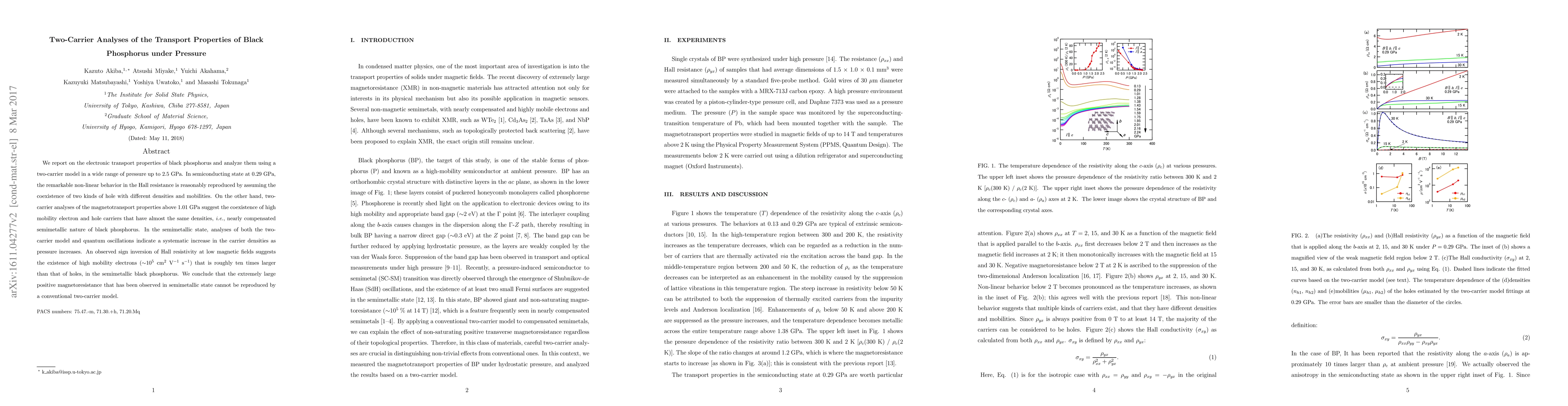 This paper analyzes the electronic transport properties of black phosphorus under pressure using a two-carrier model, revealing a semiconducting state with two types of holes and a semimetallic state with high mobility electrons and holes. The study concludes that the large magnetoresistance in the semimetallic state cannot be explained by conventional two-carrier models.