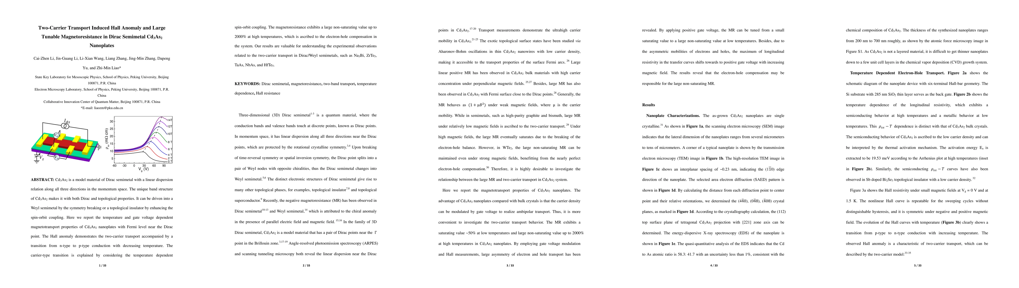 Cd3As2 is a model material of Dirac semimetal with a linear dispersion relation along all three directions in the momentum space. The unique band structure of Cd3As2 makes it with both Dirac and topological properties. It can be driven into a Weyl semimetal by the symmetry breaking or a topological insulator by enhancing the spin-orbit coupling. Here we report the temperature and gate voltage dependent magnetotransport properties of Cd3As2 nanoplates with Fermi level near the Dirac point. The Hall anomaly demonstrates the two-carrier transport accompanied by a transition from n-type to p-type conduction with decreasing temperature. The carrier-type transition is explained by considering the temperature dependent spin-orbit coupling. The magnetoresistance exhibits a large non-saturating value up to 2000% at high temperatures, which is ascribed to the electron-hole compensation in the system. Our results are valuable for understanding the experimental observations related to the two-carrier transport in Dirac/Weyl semimetals, such as Na3Bi, ZrTe5, TaAs, NbAs, and HfTe5.