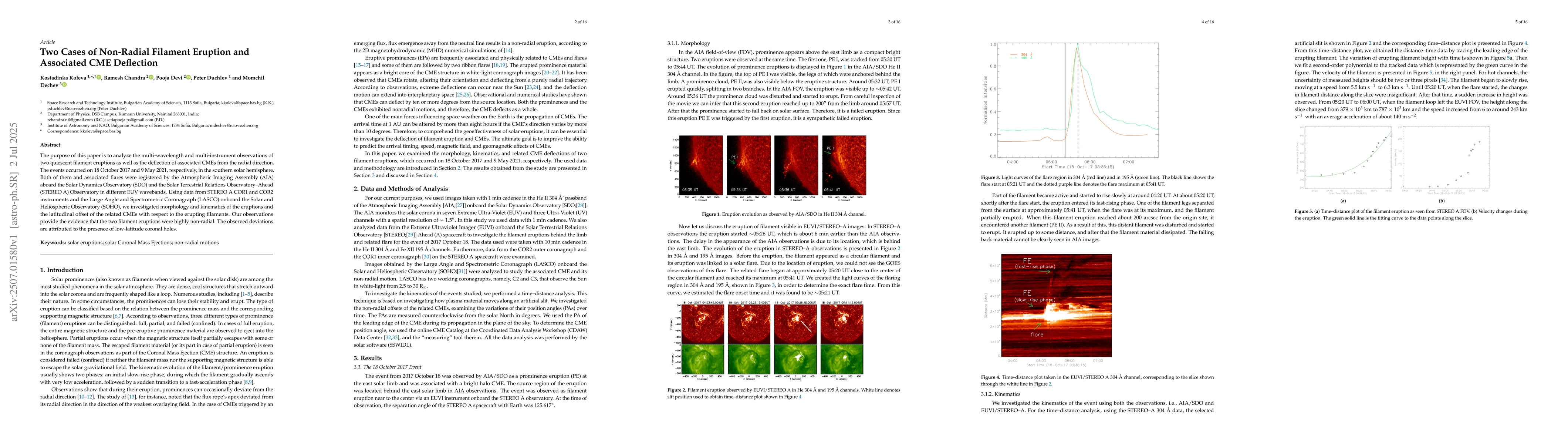 This research analyzes two non-radial quiescent filament eruptions in 2017 and 2021, using data from SDO, STEREO-A, and SOHO instruments. It concludes that the eruptions deviated significantly from radial due to low-latitude coronal holes, with implications for understanding solar activity and its effects on space weather.