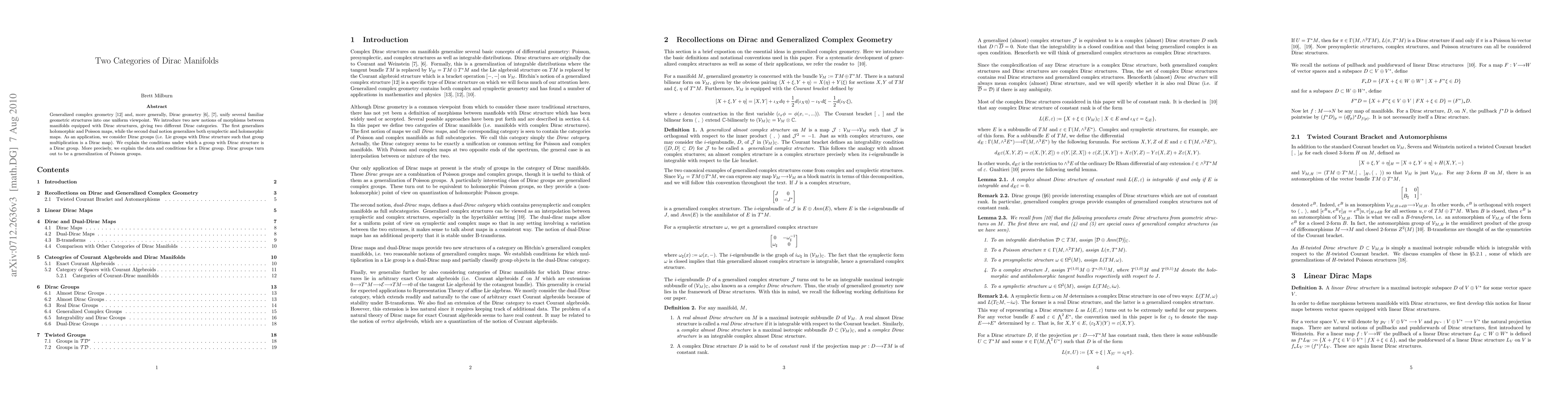 We define two categories of Dirac manifolds, i.e. manifolds with complex Dirac structures. The first notion of maps I call \emph{Dirac maps}, and the category of Dirac manifolds is seen to contain the categories of Poisson and complex manifolds as full subcategories. The second notion, \emph{dual-Dirac maps}, defines a \emph{dual-Dirac category} which contains presymplectic and complex manifolds as full subcategories. The dual-Dirac maps are stable under B-transformations. In particular we get two structures of a category on Hitchin'sgeneralized complex manifolds, i.e., two reasonable notions of generalized complex maps. We also generalize further to get categories of Dirac manifolds for which the Dirac structures lie in arbitrary exact Courant algebroids. As an example, we consider the case of a Lie group with a complex Dirac structure and establish conditions for which multiplication is a Dirac map.