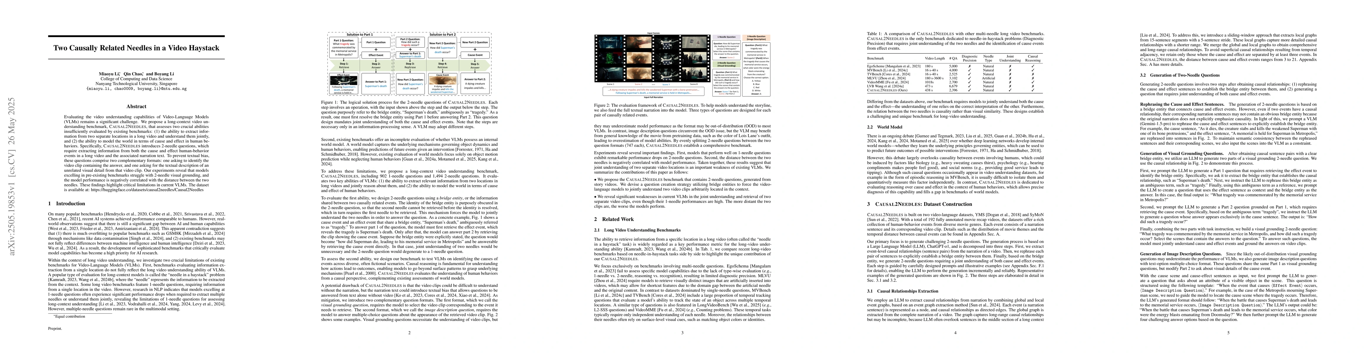 Causal2Needles benchmark and 2-needle question format to assess VLMs' joint information extraction and cause-effect modeling abilities in long videos.