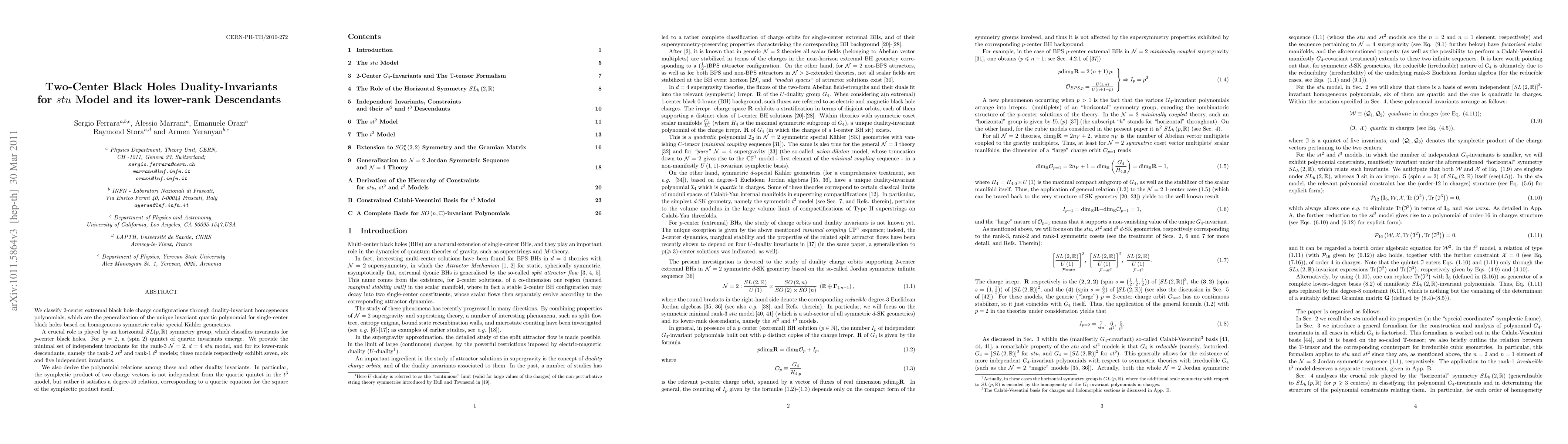 We classify 2-center extremal black hole charge configurations through duality-invariant homogeneous polynomials, which are the generalization of the unique invariant quartic polynomial for single-center black holes based on homogeneous symmetric cubic special Kaehler geometries. A crucial role is played by an horizontal SL(p,R) symmetry group, which classifies invariants for p-center black holes. For p = 2, a (spin 2) quintet of quartic invariants emerge. We provide the minimal set of independent invariants for the rank-3 N = 2, d = 4 stu model, and for its lower-rank descendants, namely the rank-2 st^2 and rank-1 t^3 models; these models respectively exhibit seven, six and five independent invariants. We also derive the polynomial relations among these and other duality invariants. In particular, the symplectic product of two charge vectors is not independent from the quartic quintet in the t^3 model, but rather it satisfies a degree-16 relation, corresponding to a quartic equation for the square of the symplectic product itself.