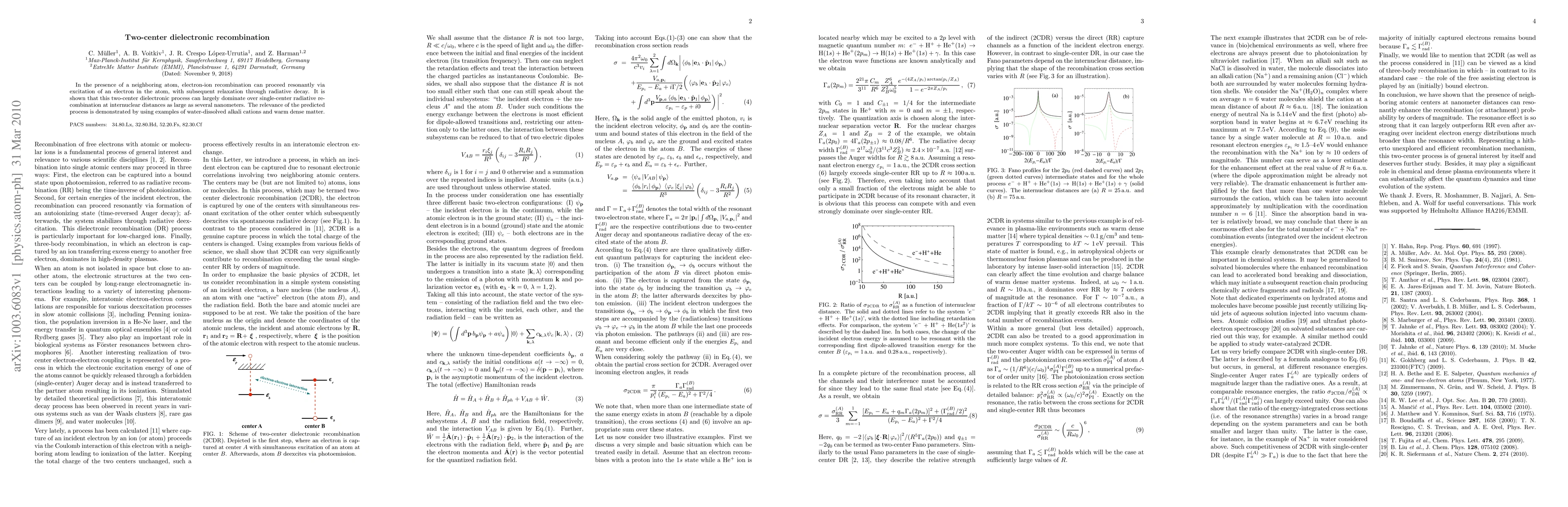 This paper investigates the two-center dielectronic recombination process, where electron-ion recombination occurs via excitation of an electron in a neighboring atom, showing it can dominate over single-center radiative recombination at distances up to several nanometers. Examples include water-dissolved alkali cations and warm dense matter.