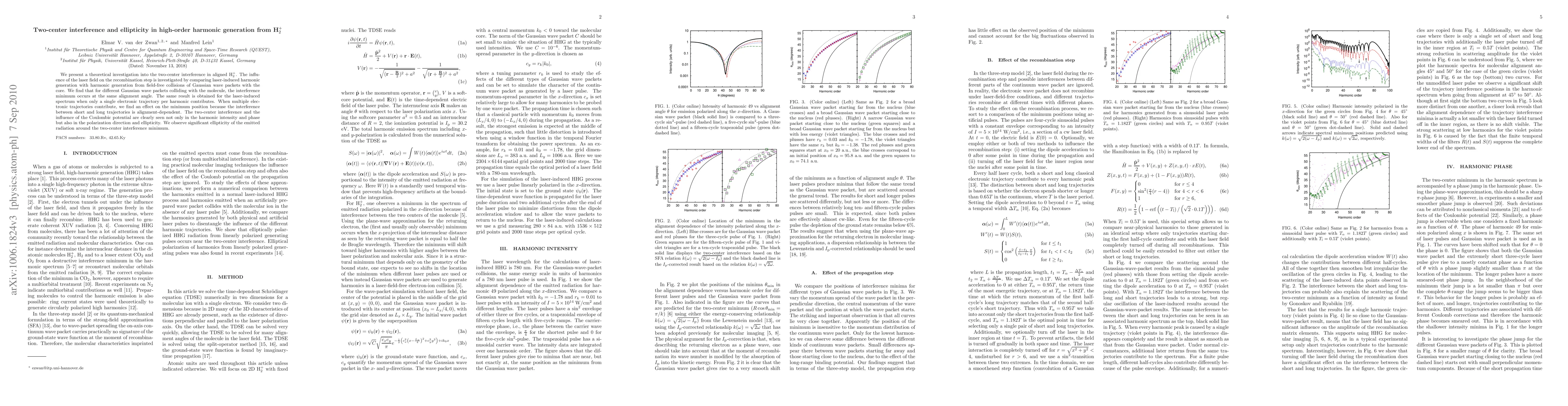 We present a theoretical investigation into the two-center interference in aligned H$_2^+$. The influence of the laser field on the recombination step is investigated by comparing laser-induced harmonic generation with harmonic generation from field-free collisions of Gaussian wave packets with the core. We find that for different Gaussian wave packets colliding with the molecule, the interference minimum occurs at the same alignment angle. The same result is obtained for the laser-induced spectrum when only a single electronic trajectory per harmonic contributes. When multiple electronic trajectories contribute, we find an effect on the minimum position because the interference between short and long trajectories is alignment-dependent. The two-center interference and the influence of the Coulombic potential are clearly seen not only in the harmonic intensity and phase but also in the polarization direction and ellipticity. We observe significant ellipticity of the emitted radiation around the two-center interference minimum.