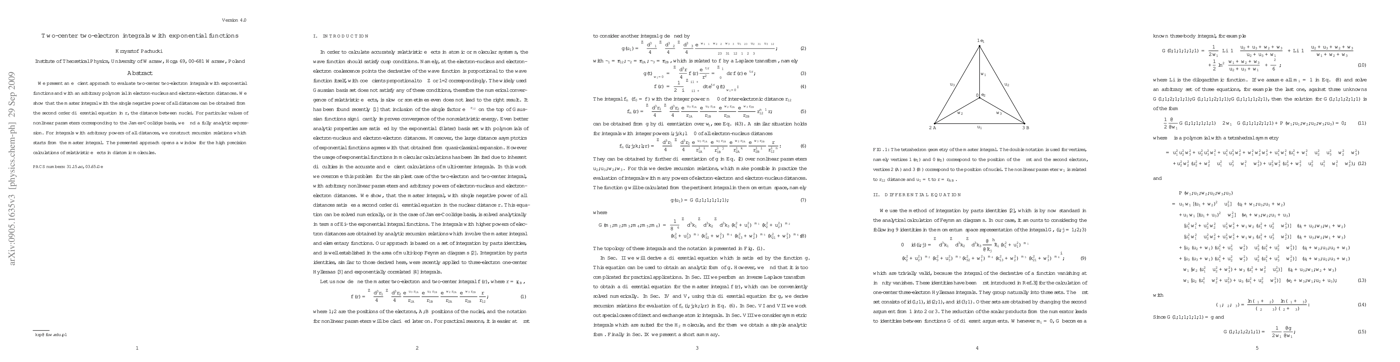 We present an efficient approach to evaluate two-center two-electron integrals with exponential functions and with an arbitrary polynomial in electron-nucleus and electron-electron distances. We show that the master integral with the single negative power of all distances can be obtained from the second order differential equation in $r$, the distance between nuclei. For particular values of nonlinear parameters corresponding to the James-Coolidge basis, we find a fully analytic expression. For integrals with arbitrary powers of all distances, we construct recursion relations which starts from the master integral. The presented approach opens a window for the high precision calculations of relativistic effects in diatomic molecules.